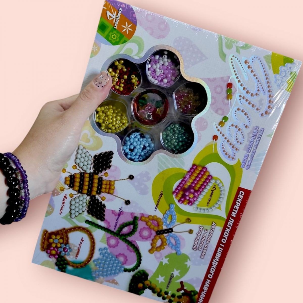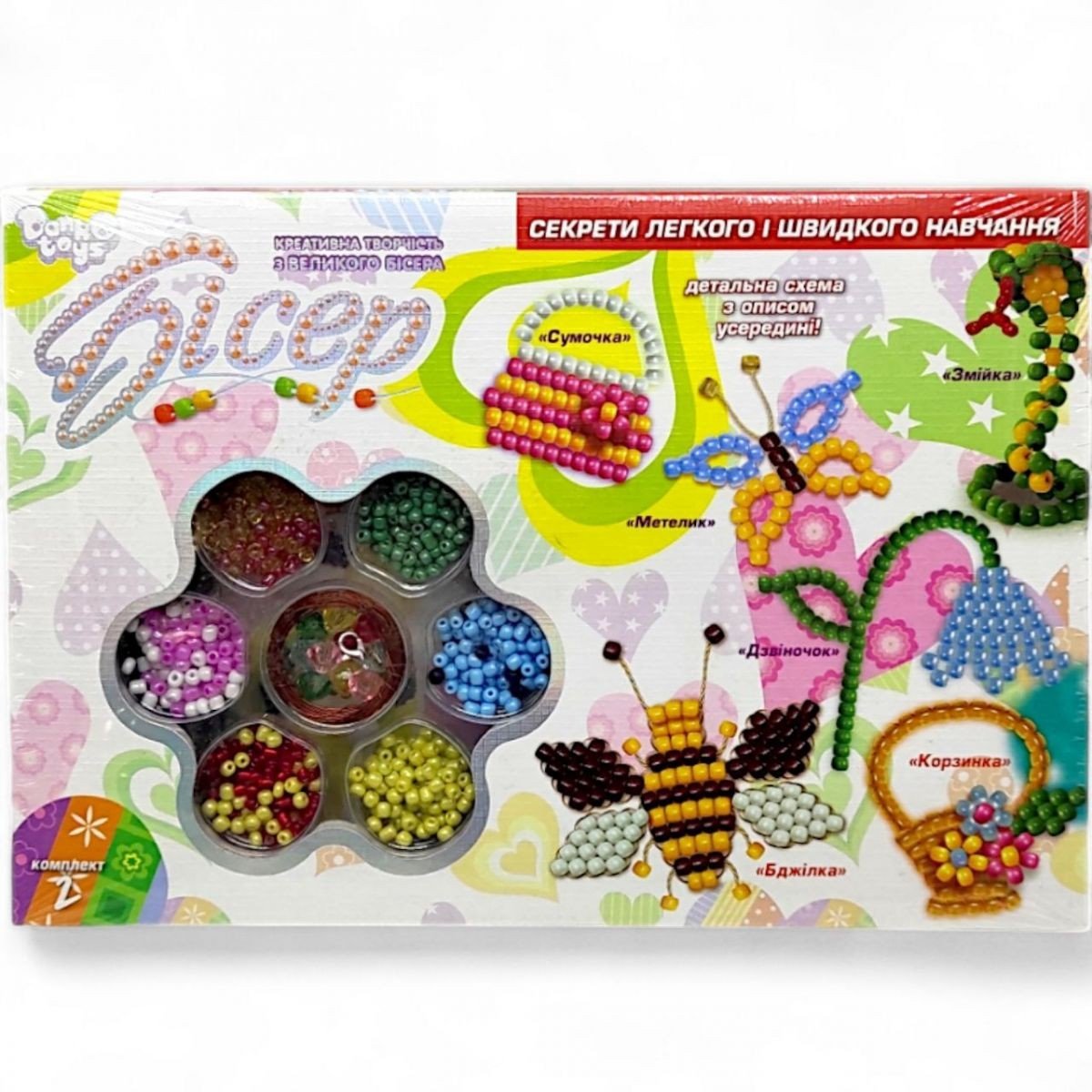 Набір для творчості "Бісер". В даному наборі Ви знайдете безліч видів бісеринок, які відрізняються за кольором і розміром, спеціальну міцну нитку-лісочку для нанизування намистин, а також докладну інструкцію з описом і схемами прикрас, які можна зробити за допомогою цього набору. Набір для виготовлення 5 виробів.