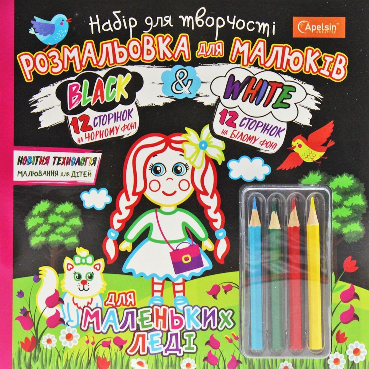 Серія розмальовок "Black & White" створена за новітньою технологією розвитку художніх здібностей дітей, яка дозволяє розфарбовувати малюнок, не виходячи за контури. Чорний фон на сторінках розмальовки сприяє тому, що навіть якщо дитина малює за межами кольорового контуру, на чорному цього не видно, тому дитина не засмутиться, а малюнок виходить красивий та в межах заданих ліній. Розмальовки укомплектовані олівцями чотирьох кольорів у зручному блістері! Контури малюнка відповідають кольорам олівців, завдяки чому дитині легко обрати олівець для розфарбування. Під кожним зображеннями є його назва англійською та українською мовами, що сприяє легкому вивченню англійських слів з раннього віку, коли в дитини формується система образів та асоціацій.