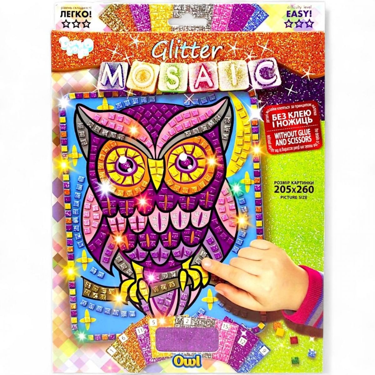 Набір для творчості "Блискуча мозаїка". Розвиває креативне мислення, творчі здібності, художній смак. Інструкція: 1) Беремо картинку і палетку з наклейками; 2) Підбираємо палетки з наклейками згідно з номерами, вказаними на коробці; 3) Відокремлюємо кубики-наклейки від палеток і клеїмо їх на зазначені номери картинки; 4) З решти наклейок оформляємо рамку до готової мозаїці. Без клею і ножиць. Розмір картинки - 20,5 х 26 см.