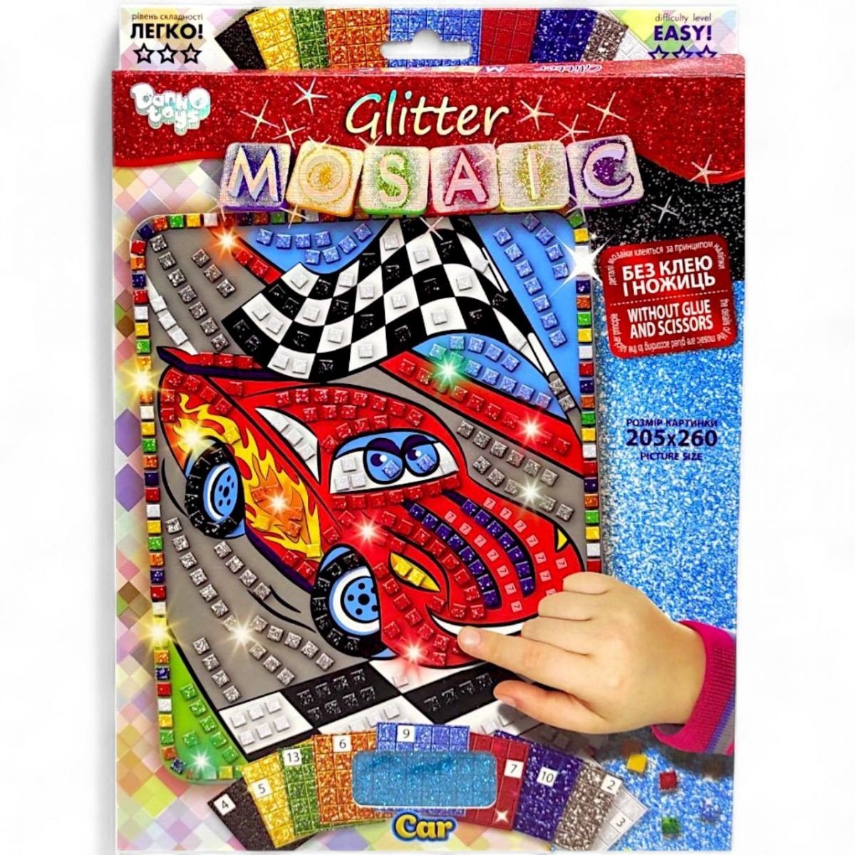 Набір для творчості "Блискуча мозаїка". Розвиває креативне мислення, творчі здібності, художній смак. Інструкція: 1) Беремо картинку і палетку з наклейками; 2) Підбираємо палетки з наклейками згідно з номерами, вказаними на коробці; 3) Відокремлюємо кубики-наклейки від палеток і клеїмо їх на зазначені номери картинки; 4) З решти наклейок оформляємо рамку до готової мозаїці. Без клею і ножиць. Розмір картинки - 20,5 х 26 см.
