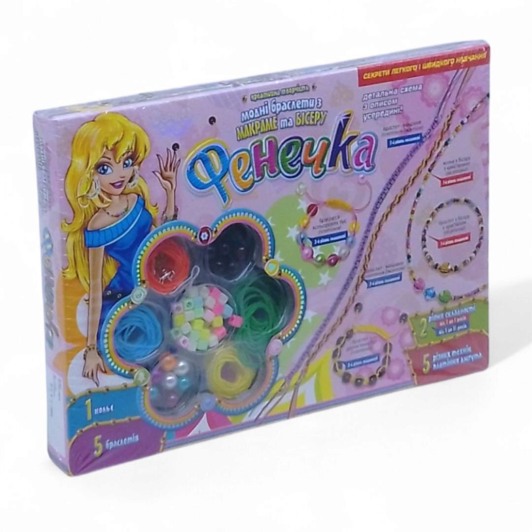 Набір для творчості "Фенічка". Виготовлення 1 кольє і 5 браслетів з бісеру і макраме різної складності. Комплектація: різнобарвна нитка "джгут", еластична нитка, різнокольорові намистини, полімерні кристали, різнокольоровий бісер, металевий замок - карабін, деревяні намиста, детальна покрокова інструкція.