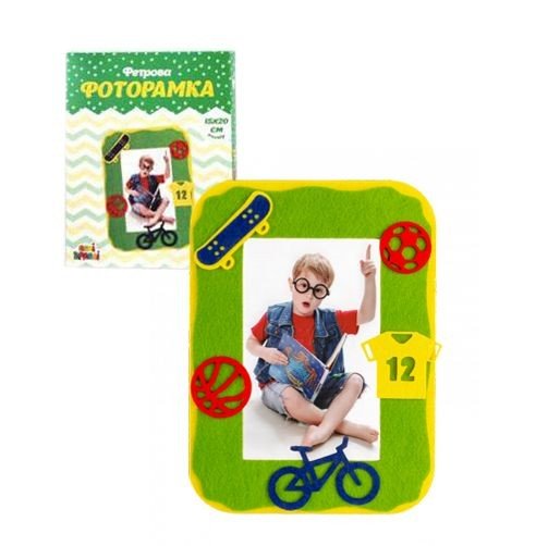 Набір для творчості "Фоторамка". Можна створити і декорувати красиву, яскраву фоторамку з фетру. У наборі є: фетрові викрійки, підставка для рамки, клей. Розмір готового виробу - 15х20 см.