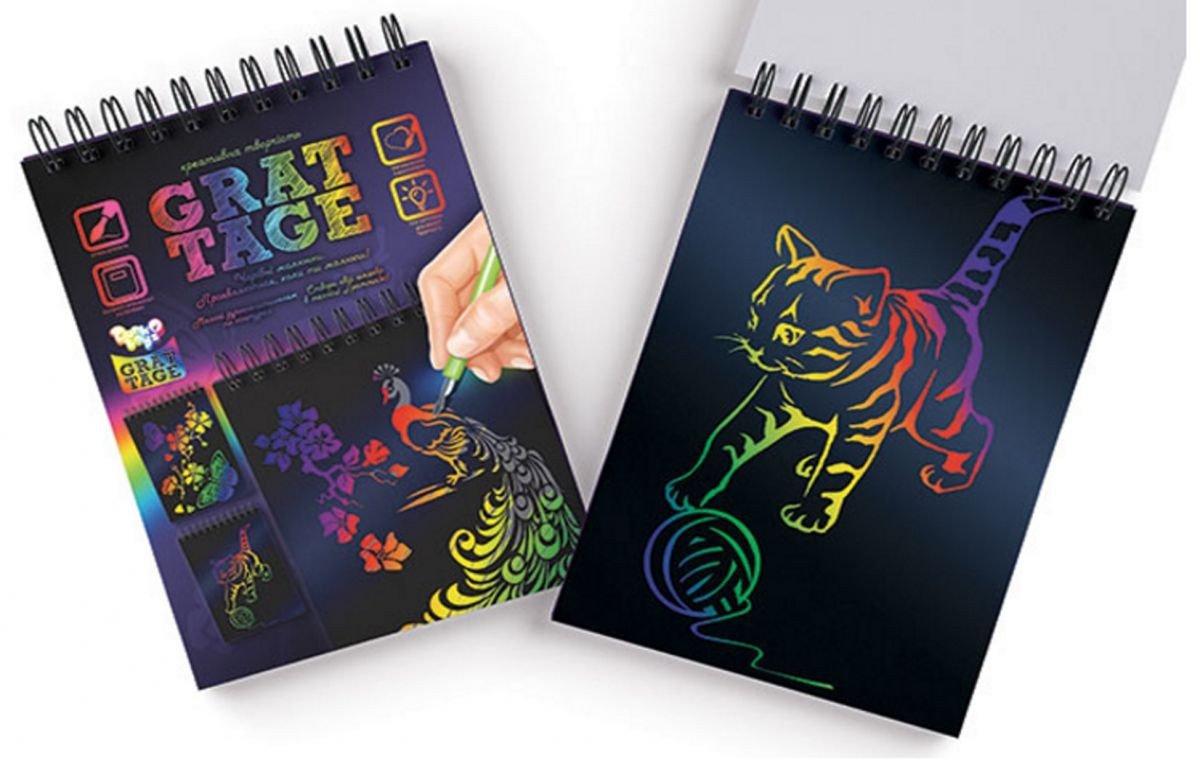 Набір для творчості "GRATTAGE" А6. Гратаж - це спосіб виконання картини, методом процарапуванії зображення на картоні гострим інструментом. Знімаючи штихелем шар захисної фарби проявляється яскравий і оригінальний малюнок. Блокнот містить три заготовки з контурами і три заготовки для індивідуальних і творчих відкриттів.
