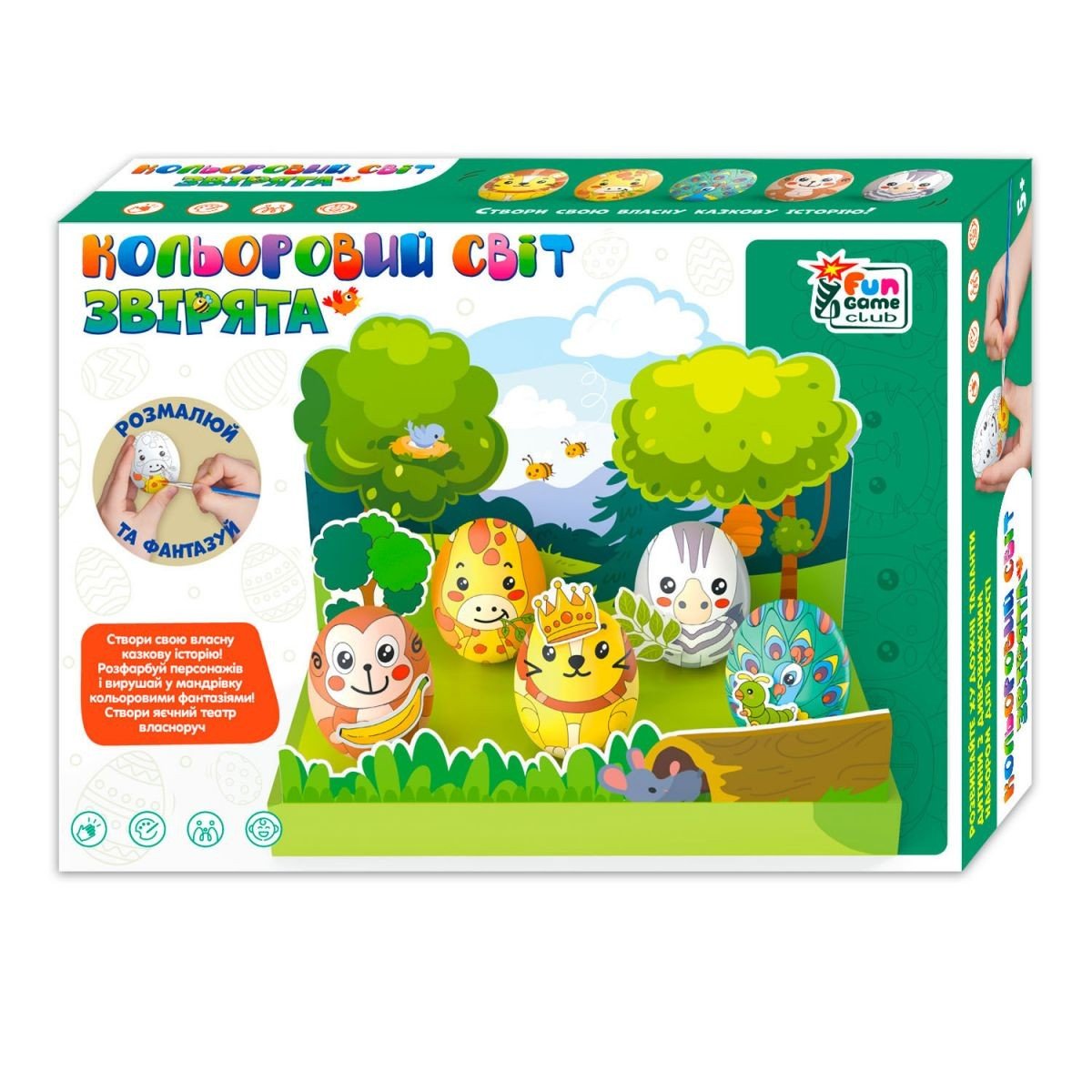 Бренд: Fun Game Мова: Українська Упаковка: Коробка Колір: Різнобарв'я Вага з упаковкою: 165 г Габарити в упаковці: 5 x 24 x 17 см Країна виробник: Україна Матеріал: Комбінований Комплектація: 3D ігрове поле, набір яєць, пензлик, палітра, фарби, двосторонній скотч, елементи декору, інструкція