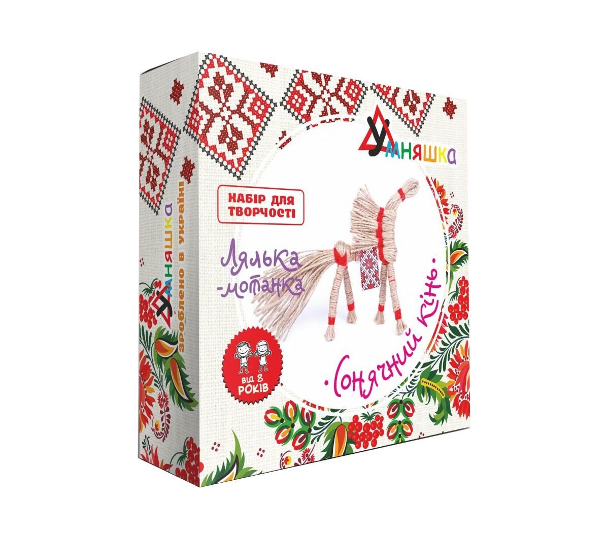 Набір для творчості "Лялька-мотанка: Сонячний кінь". При виготовленні тканинної ляльки беруться тільки нові натуральні тканини, які забороняється різати і проколювати, але дозволяється рвати на більш дрібні частини і примотували їх нитками один до одного, в результаті чого виходить "мотанка". Все що потрібно для творчості вже є в наборі.