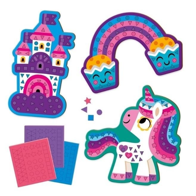 Набір для дитячої творчості "Єдиноріг". Складається з 3-х яскравих картонних основ та трьох мʼяких планшетів з елементами мозаїки. На основах контуром зображені підказки про те, які елементи потрібно клеїти. Набір допомагає малюкам розвинути дрібну моторику та відкрити нові творчі здібності. Розмір основи: 19х4 см.