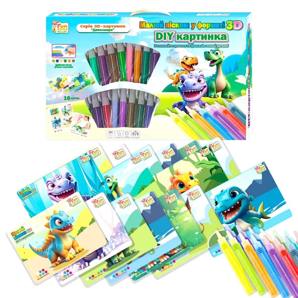 Опис Набір для творчості "Малюй піском: Динозаври", 16 карток, 12 кольорів піску, 2 мольберти, щітка