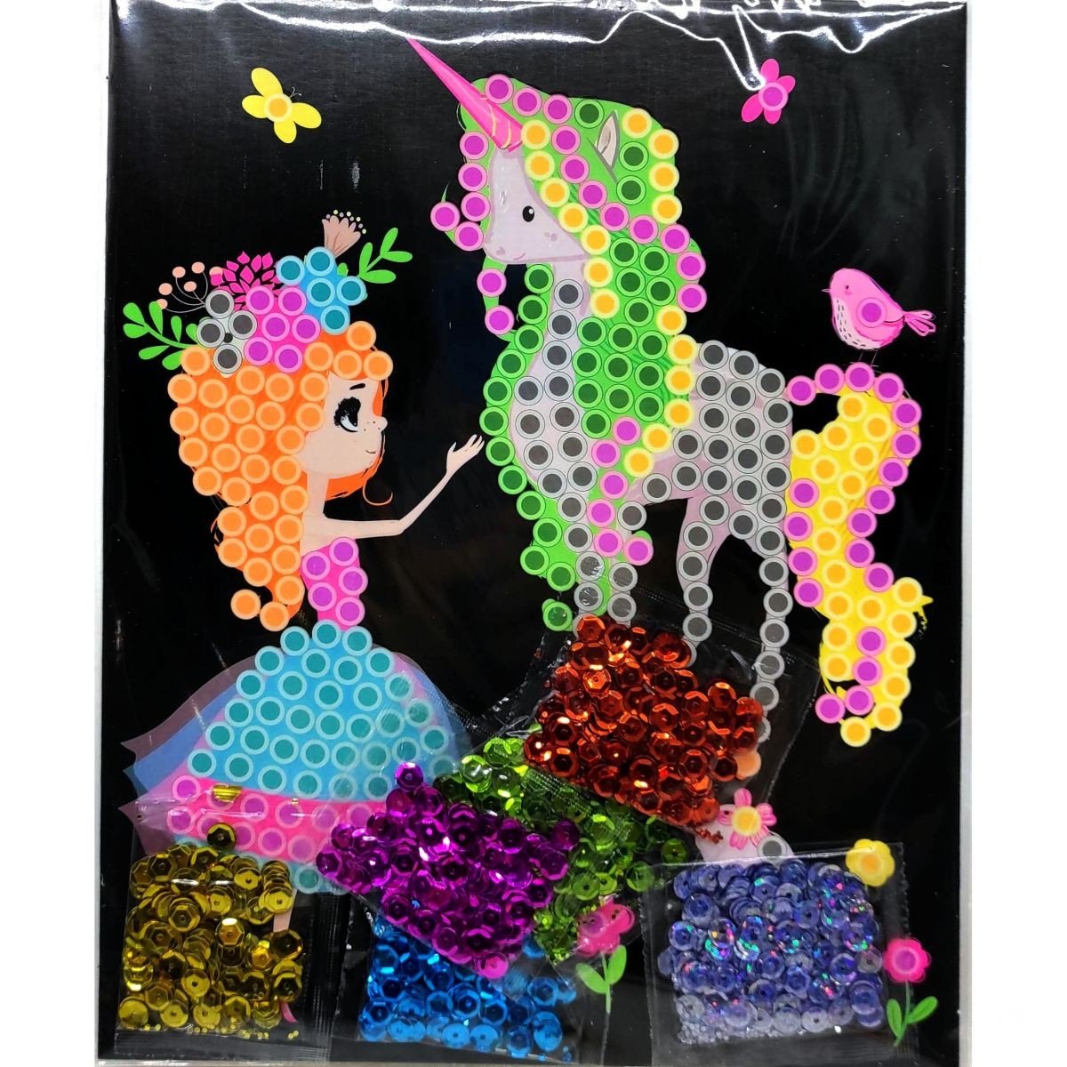 Набір для створення картини з паєток.За допомогою даного набору можна створити гарну мозаїку, яка стане чудовою прикрасою інтерʼєру дитячої кімнати. Принцип створення картини подібний до створення алмазної мозаїки: паєтки різних кольорів слід розміщувати по відповідних осередках. Розмір виробу: 20х25 см.