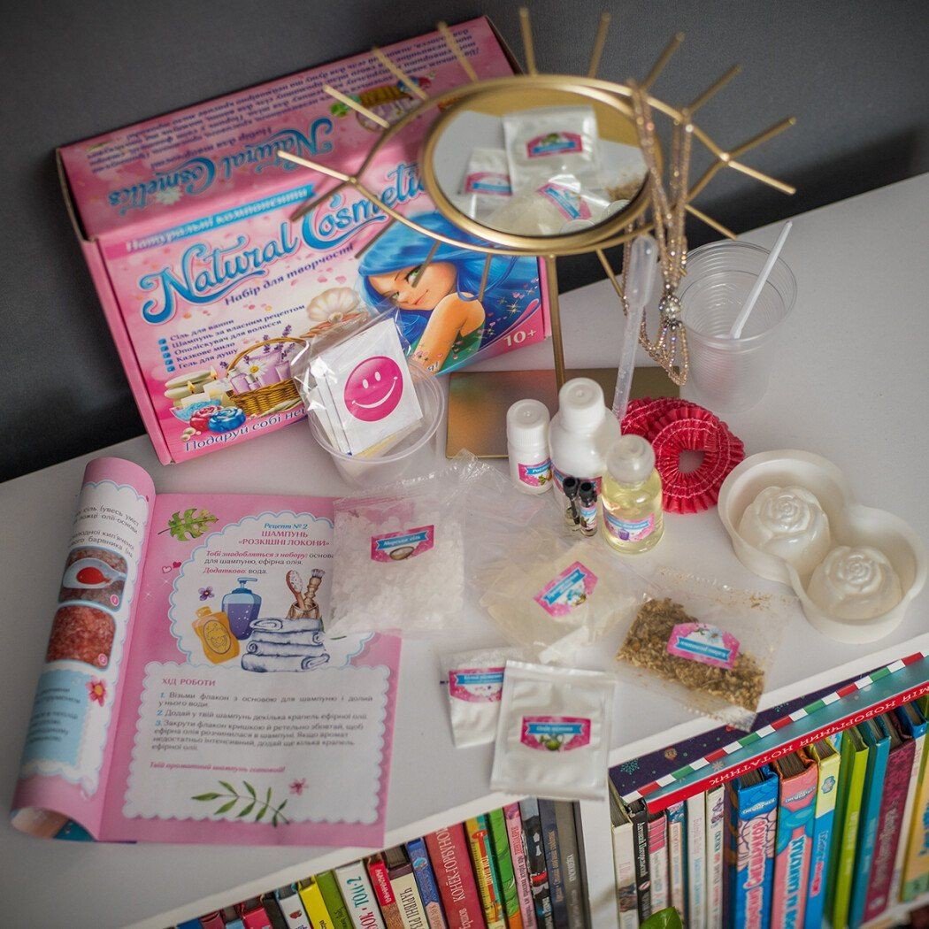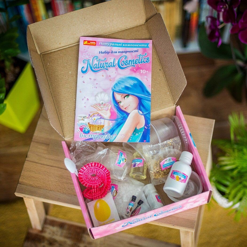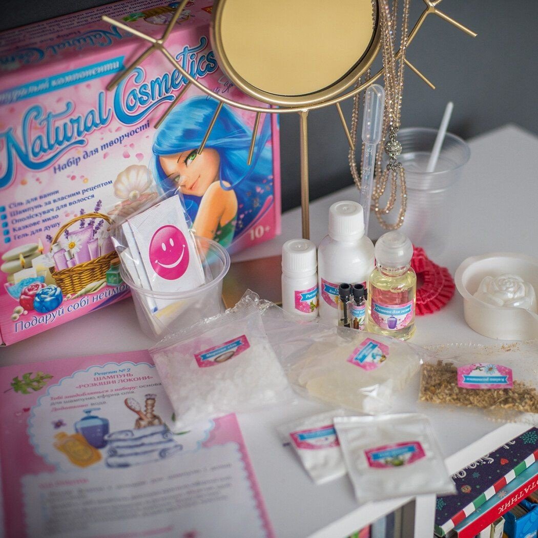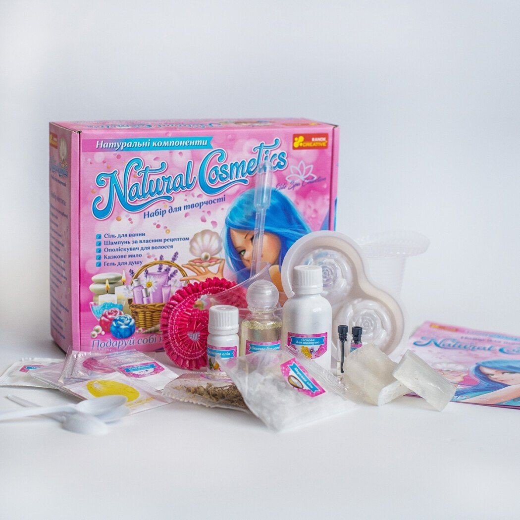Новинка з серії спа! "Natural Cosmetics" - це чудове поєднання користі та творчої креативності в одному наборі! Універсальний подарунок для дівчаток на будь-які свята! 5 косметичних засобів в 1 наборі! Дівчаткам завжди хочеться чогось незвичайного, красивого, приємного. Пропонуємо створити натуральну косметику для тіла власноруч! Ароматна сіль для ванни, шампунь та ополіскувач для волосся, лимонний гель для душу та неймовірно красиве мило-троянди буде бадьорити й підіймати настрій кожного дня! Не віриш? Створи та перевір! Набір містить: морську сіль (неподрібнену), ефірну олію, олію-основу, пластикову ложку, основу для шампуню, квіти ромашки, пластиковий стаканчик, прозору мильну основу, блістерну форму для мила, харчові барвники, білий пігмент, піпетку, олію основу з ефірною олією, основу для гелю, захисні рукавички, шапочку для душу, покрокову інструкцію.