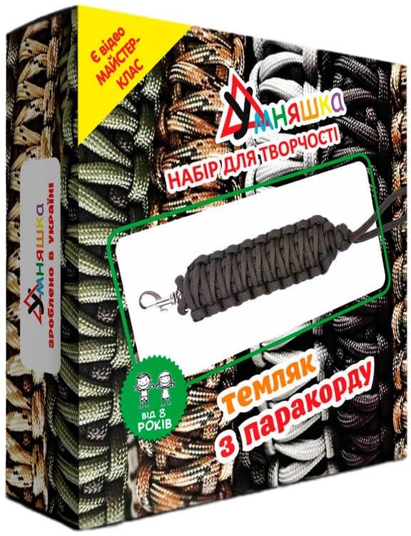 Набір для творчості "Плетіння з паракорд: Темляк". Темляком називають петлю, закріплену на рукояті інструменту або зброї. Все необхідне є в наборі. На коробці посилання на відеоінструкцію.