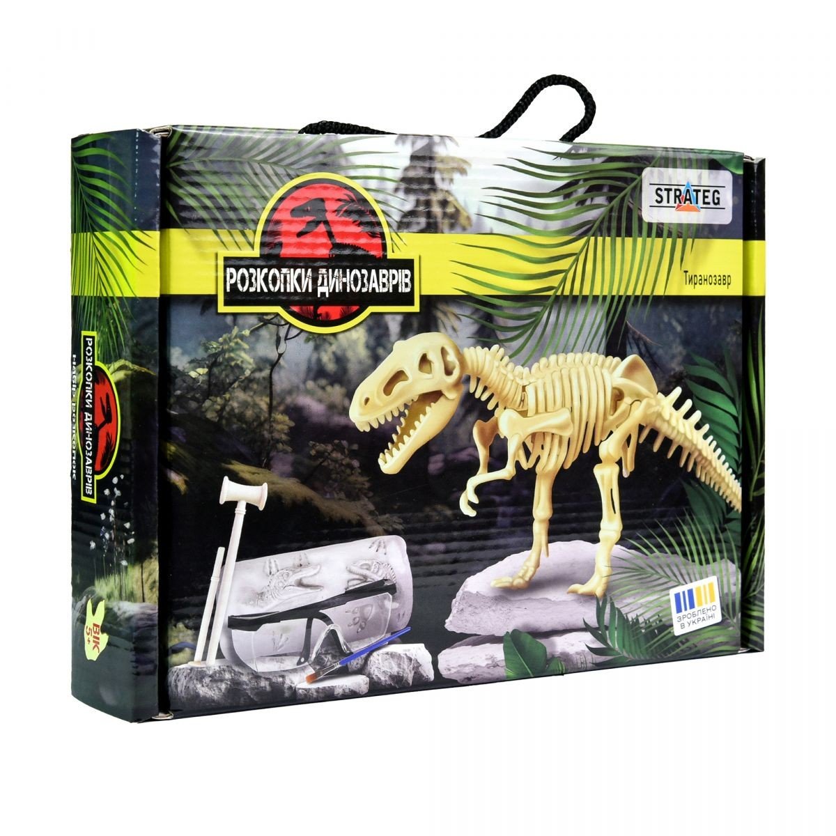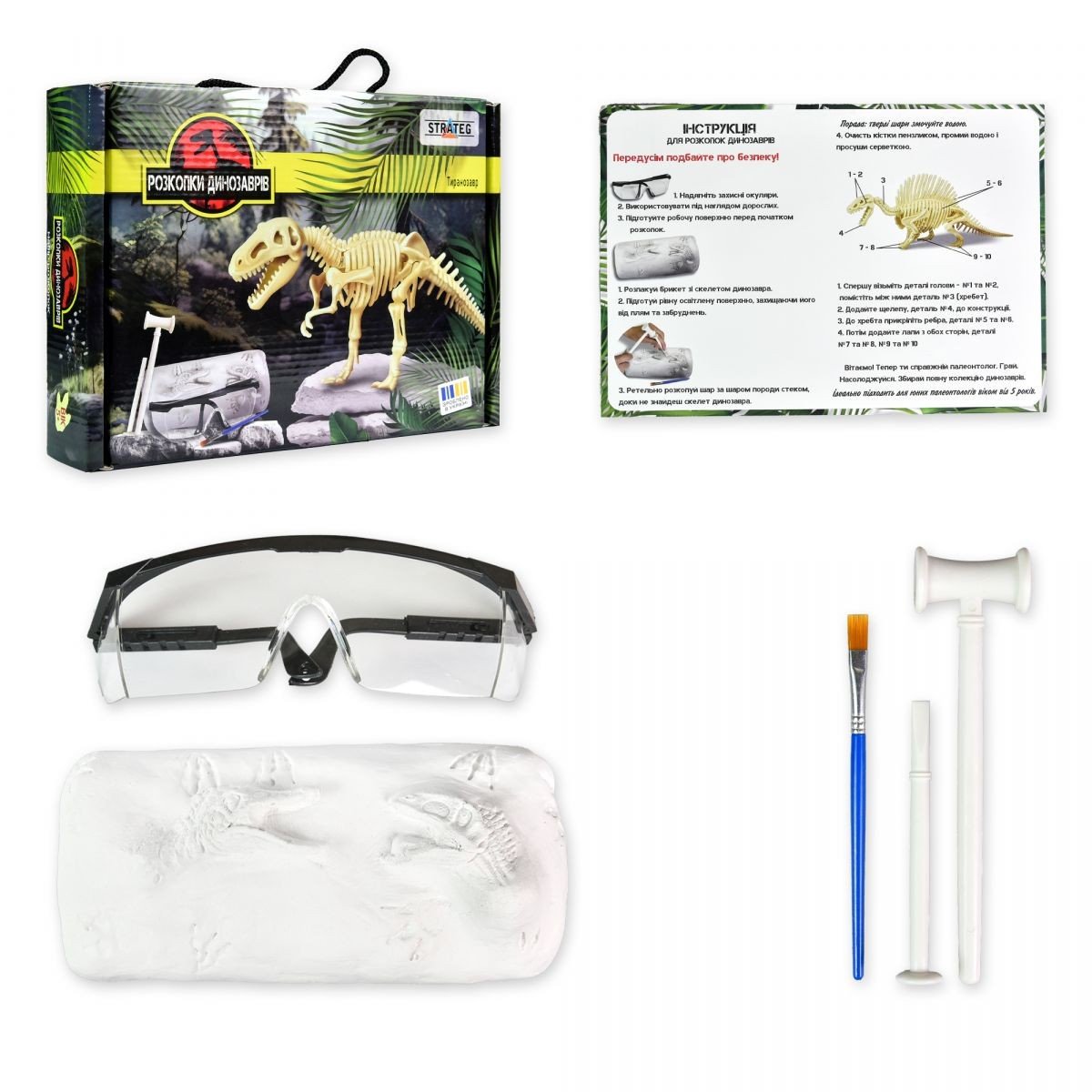 Бренд: Strateg Упаковка: Коробка Колір: Різнобарв'я Вага з упаковкою: 550 г Габарити в упаковці: 18 x 25 x 5.5 см Країна виробник: Україна Матеріал: Комбінований Комплектація: Гіпсовий брикет з прихованим скелетом, інструменти для розкопок, захисні окуляри та інструкція