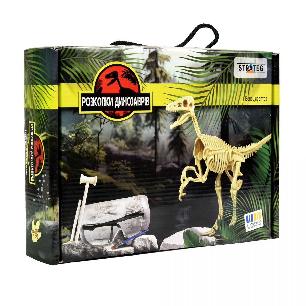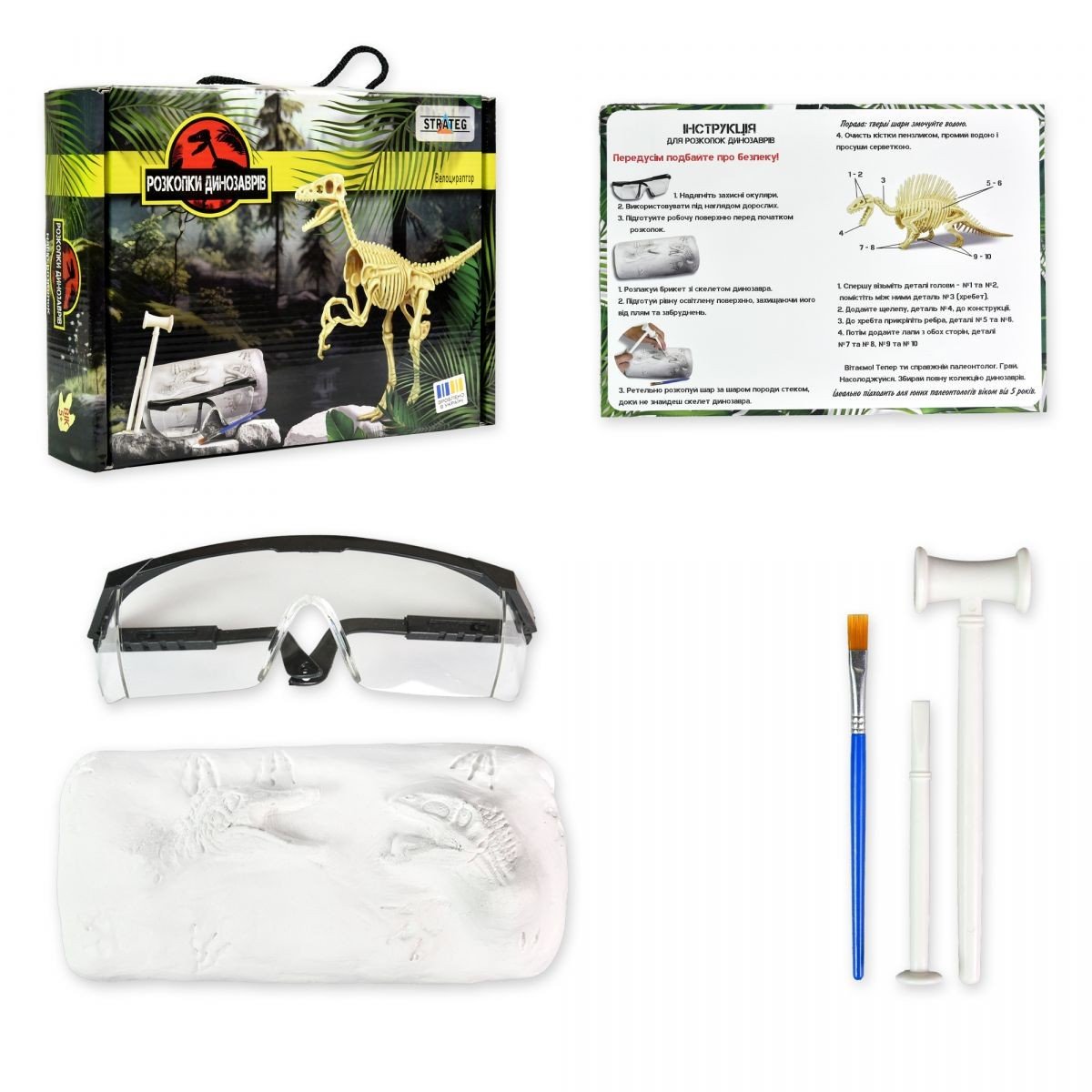 Бренд: Strateg Упаковка: Коробка Колір: Різнобарв'я Вага з упаковкою: 550 г Габарити в упаковці: 18 x 25 x 5.5 см Країна виробник: Україна Матеріал: Комбінований Комплектація: Гіпсовий брикет з прихованим скелетом, інструменти для розкопок, захисні окуляри та інструкція