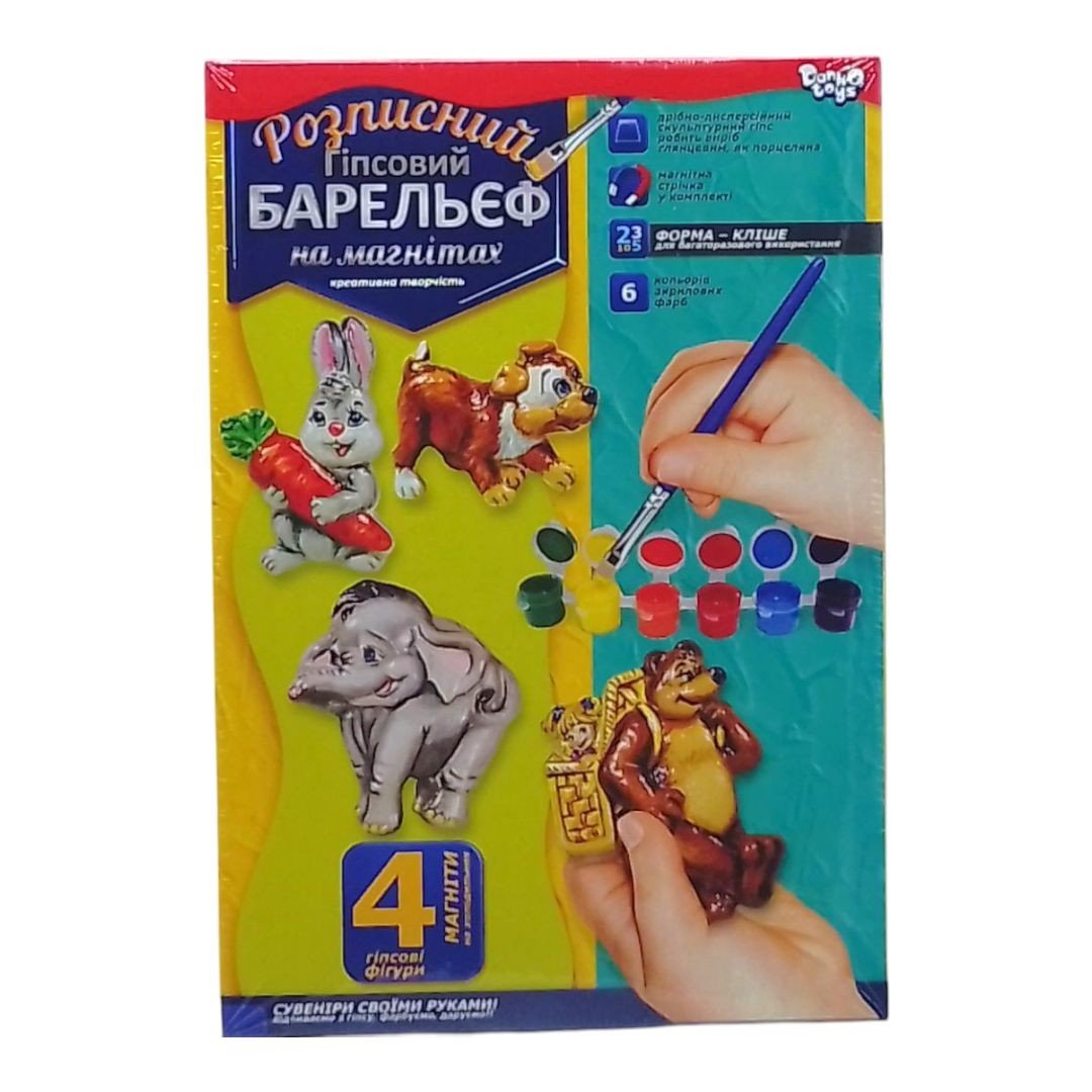 Набір для творчості "Писаний барельєф на магнітах". Для початку, готуємо гіпсовий розчин, потім заливаємо його в формочки (4 фігури). Після того як розчин застигне, потрібно приклеїти магнітну стрічку на зворотному боці фігурки. Останній крок - розфарбовування фігурок (фарби і пензлик в комплекті).