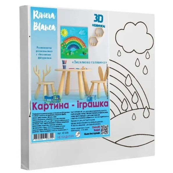 Бренд: Riviera Blanca Упаковка: Плівка Колір: Різнобарв'я Вага з упаковкою: 420 г Габарити в упаковці: 25 x 25 x 2 см Габарити без упаковки: 25 x 25 x 2 см Країна виробник: Україна Матеріал: Комбінований Комплектація: синтетичне полотно, натягнуте на дерев'яну рамку з нанесеними контурами майбутнього малюнка; водорозчинні акрилові фарби; пензлі різного розміру; гіпсові фігурки