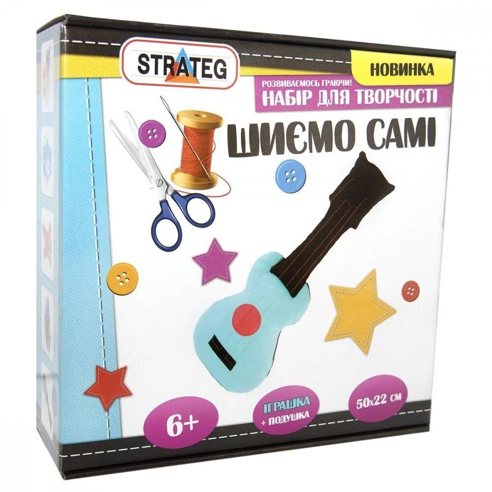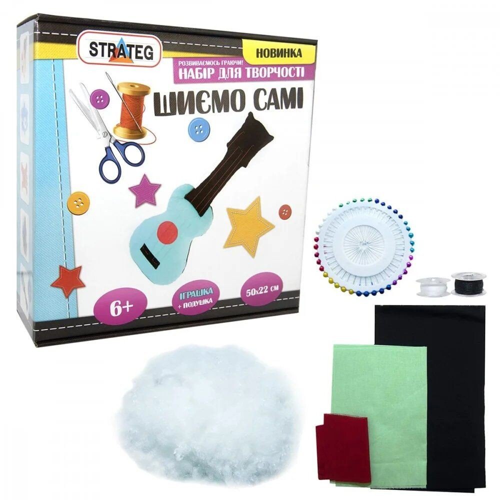 Набір для творчості "Шиємо самі" буде цікавий дорослим і дітям, які зможуть зробити своїми руками іграшки дитині або сувенір знайомим і близьким людям. Набір включає: комплект тканини, мʼякий наповнювач, нитки, голки, крейда, шпильки, намистинки, стрічку, інструкція, викрійку.
