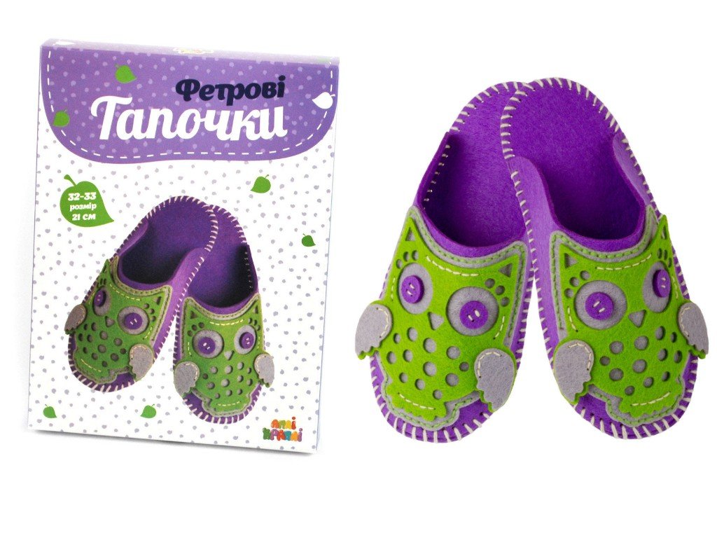 За допомогою цього набору можна створити оригінальні фетрові тапочки з зображеннями совенят. У комплекті є все необхідне для їх створення: фетрові викрійки, пластикова голка, набір ниток і інструкція. Розмір готових тапочок: 32-33 (21 см).
