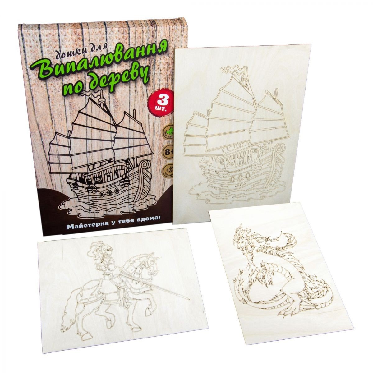 Набір для творчості "Випалювання по дереву". У комплекті: 3 дошки для випалювання та інструкція. Розміри дощок: 14,8 х 21 см (2 шт) і 29,7 х 21 см. Випалювач в комплект не входить. Набір виготовлений з екологічних і безпечних матеріалів. Для дітей від 8-ми років.