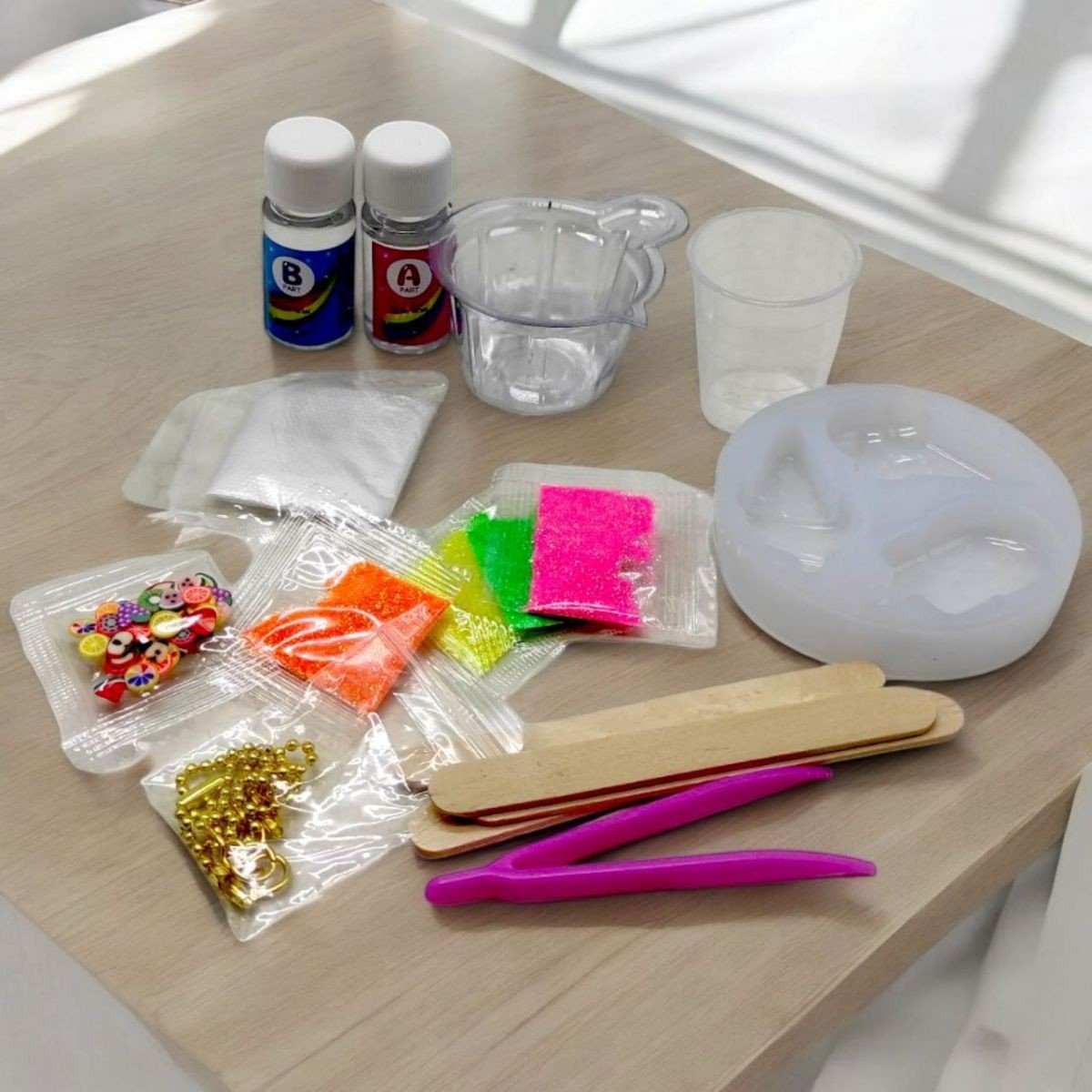 Комплектація: 2 баночки з епоксидною смолою, 4 види блискіток, елементи декору, ланцюжки, молд силіконовий на 3 фігурки, мірна склянка, склянка для змішування, пінцет пластиковий, дерев'яні лопатки, рукавички, детальна інструкція
