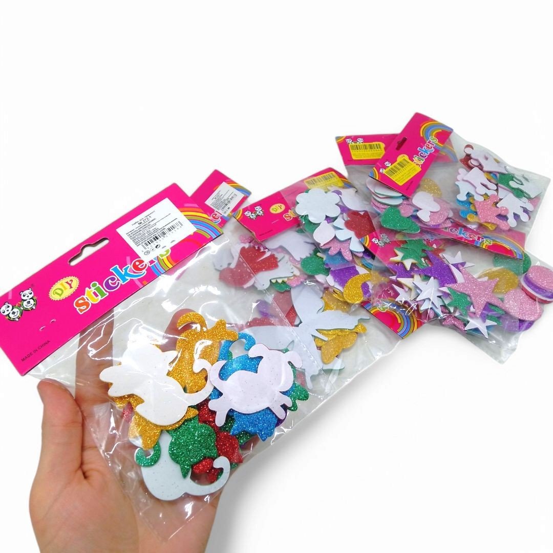 Набір декоративних елементів для творчості. Кожна деталь виконана з фоамірану. Має клейку основу та добре кріпиться на різноманітні поверхні. З таких деталей можна створювати різноманітні аплікації, а також, можна використовувати їх як стікери. Виготовлено з якісних та безпечних матеріалів.