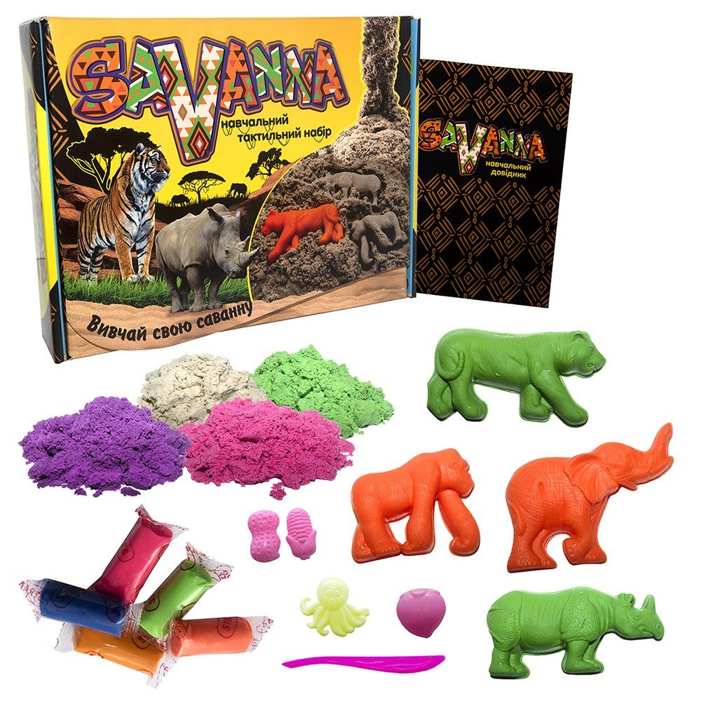 Навчальний тактильний набір "Savanna". У комплекті: кінетичний пісок (4 кольори по 350 г), тісто для ліплення (5 кольорів), контейнер для зберігання тіста, навчальний посібник і картки, пасочки для піску і тіста (8 шт) і стек. Кінетичний пісок схожий на звичайний вологий пісок, але разом з цим він абсолютно сухий, приємний на дотик, повітряний і м'який, тече крізь пальці, залишаючи долоні сухими і чистими, прекрасно зберігає форму під час ліплення. Тісто для ліплення добре тримає форму і не прилипає до рук. За допомогою набору, дитина з легкістю зможе вивчити нових тварин і інформацію про них. На картках є невеликі замітки, що розповідають про мешканців савани. Доповнити навчання наочним прикладом допоможуть фігурки тварин, зроблені своїми руками з кінетичного піску та тіста.
