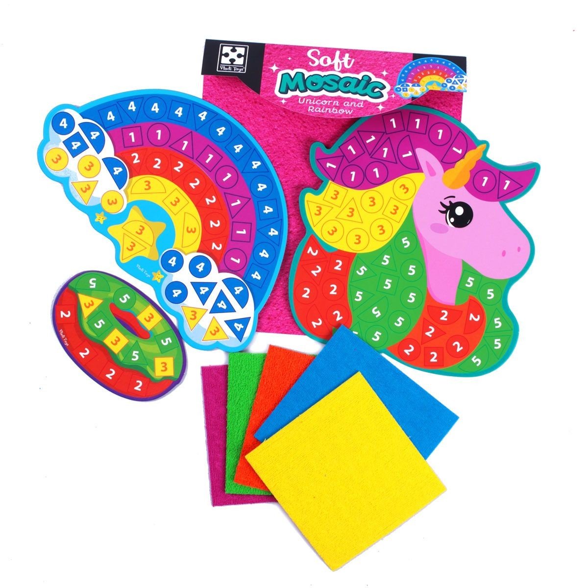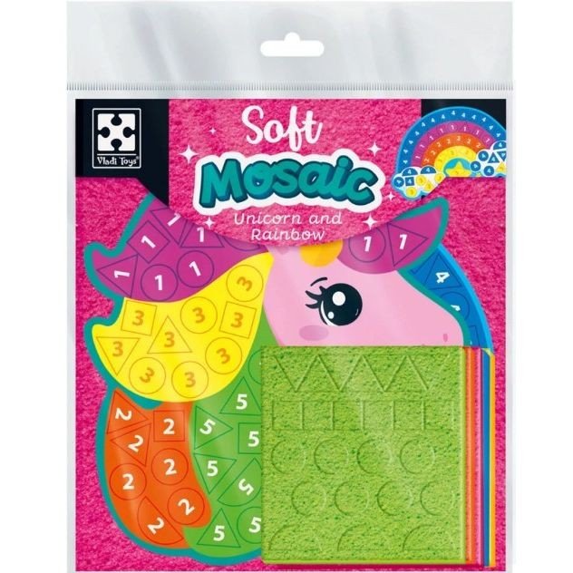 Набір для дитячої творчості зі плюшевою мозаїкою. Складається з 5-х яскравих картонних основ та трьох мʼяких планшетів з елементами мозаїки. На основах контуром зображені підказки про те, які елементи потрібно клеїти. Набір допомагає малюкам розвинути дрібну моторику та відкрити нові творчі здібності.
