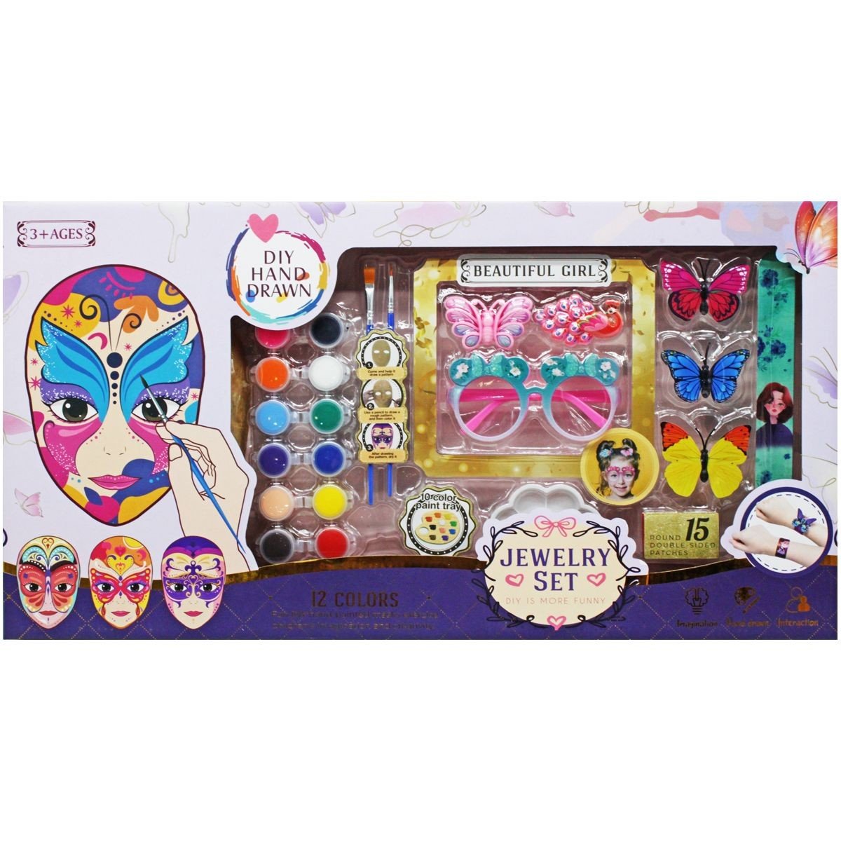 Комплектація: Маска, 12 кольорів фарби, палітра, 2 пензлики, окуляри, браслет, 2 шпильки, прикраси