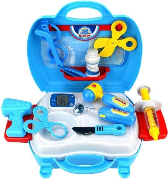 Набір доктора "Medical" складається з пластикового валізки з ручкою, який перетворюється в докторський медичний столик. З боків столика знаходяться полички, а на кришці є гачки для інструментів. У комплекті: 8 медичних інструментів (2 з яких мають підсвічування), баночка з ліками, окуляри доктора і наклейки. За допомогою набору можна відчути себе справжнім доктором.