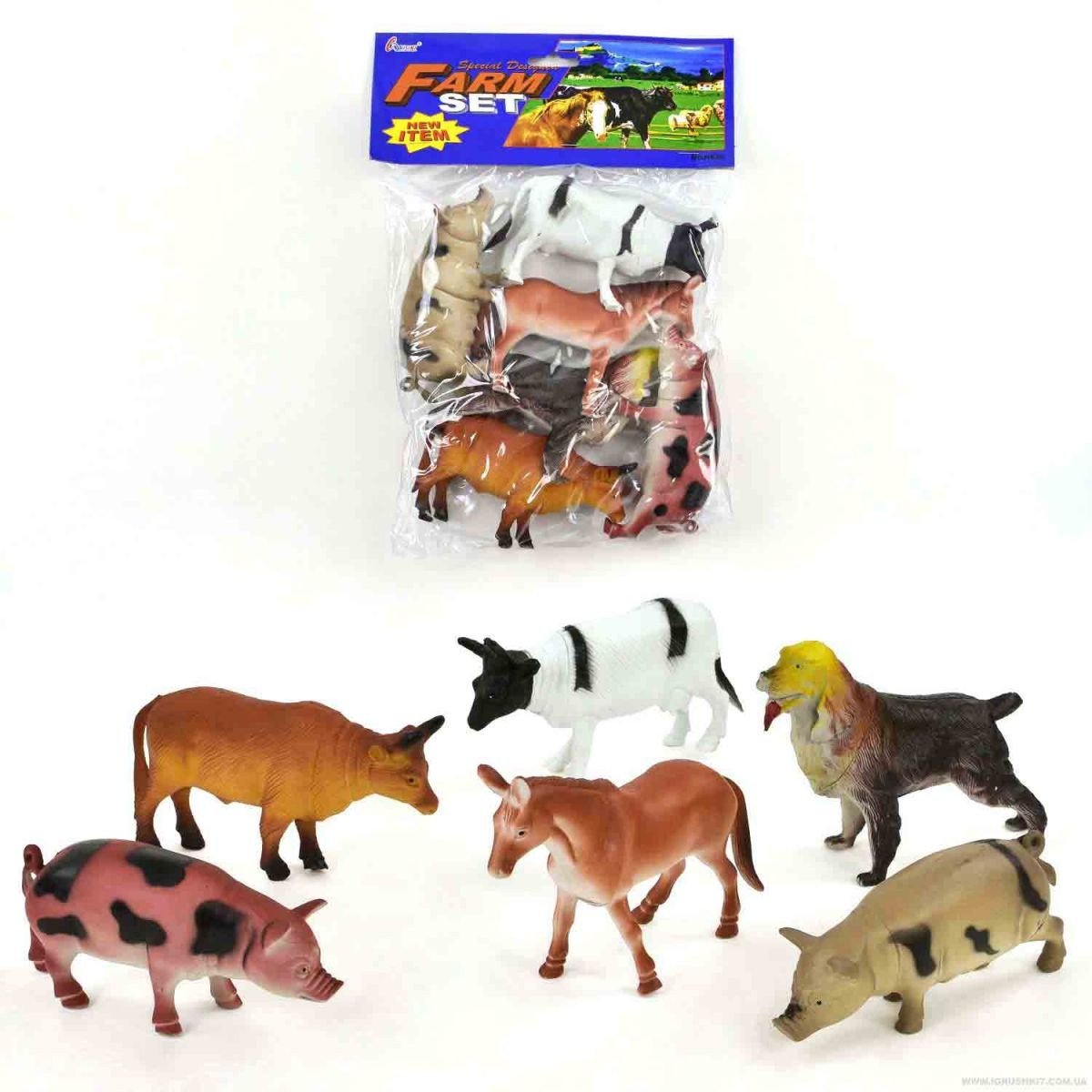 Набір "Домашні тварини". 6 тварин: 2 свині, корова, бик, кінь, собака. Тверда гума. Розмір однієї іграшки - 12 х 3 х 7,5 см.