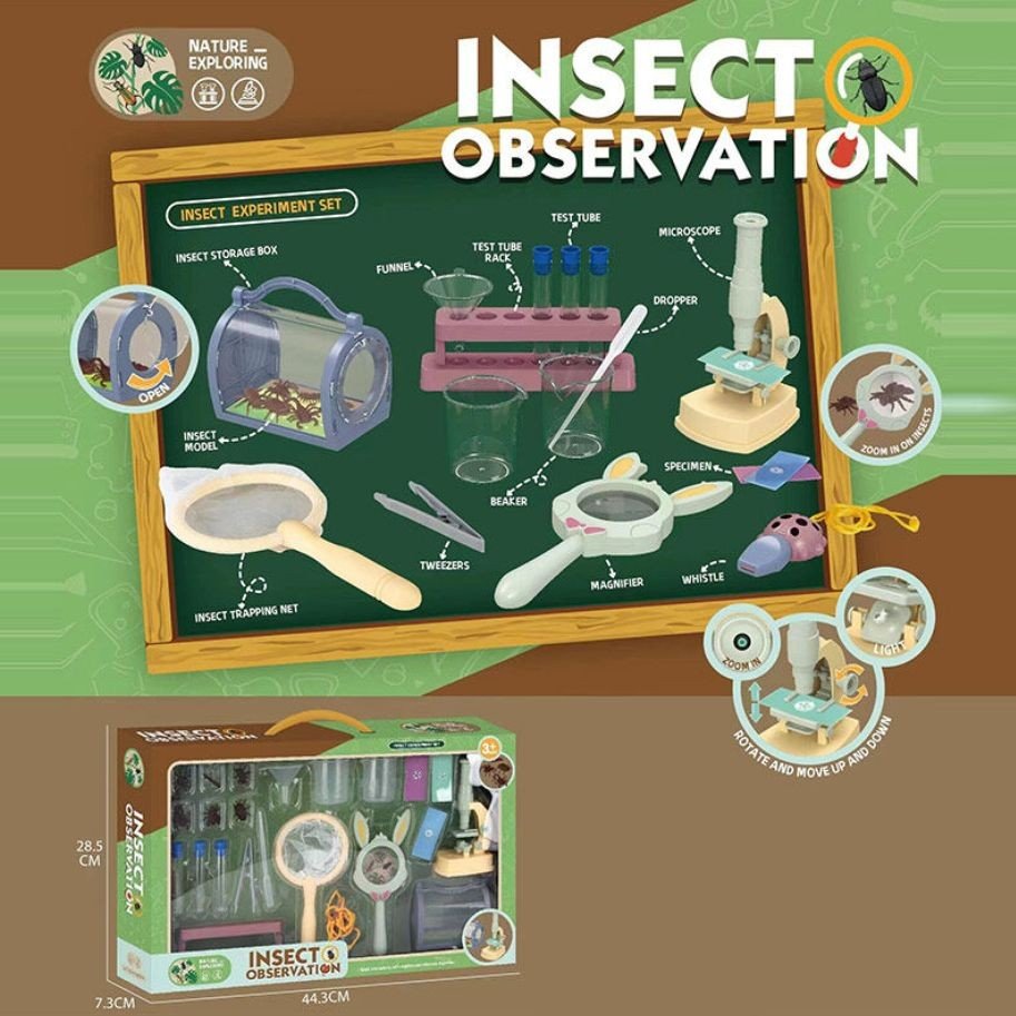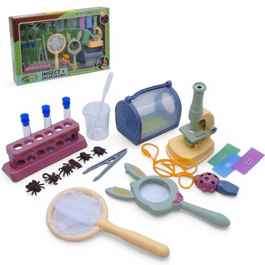 Ігровий набір для дослідів стане ідеальним подарунком для дітей, які люблять природу і прагнуть дізнаватися більше про світ комах. Мікроскоп з можливістю збільшення та підсвіткою працює від 2 батарейок типу АА (в комплект не додається). Збірний стенд для пробірок та набір колб для експериментів. Лупа для детального вивчення комах. Сачок для ловлі метеликів та інших комах. Контейнер для тимчасового зберігання знайдених зразків. Пінцет, лійка, піпетка та інші лабораторні аксесуари; реалістичні моделі комах для початкового вивчення; свисток. Компактна валіза для зручного зберігання всіх елементів.