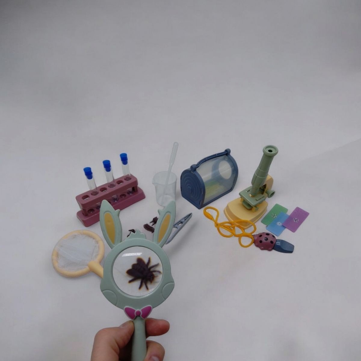 Бренд: MIC Упаковка: Коробка Колір: Різнобарв'я Вага з упаковкою: 475 г Габарити в упаковці: 28.5 x 44.5 x 7.5 см Країна виробник: Китай Матеріал: Комбінований Комплектація: Мікроскоп, збірний стенд для пробірок та набір пробіркових колб, лупа, сачок, контейнер, пінцет, лійка, піпетка та інші лабораторні аксесуари, реалістичні моделі комах для початкового дослідження, свисток