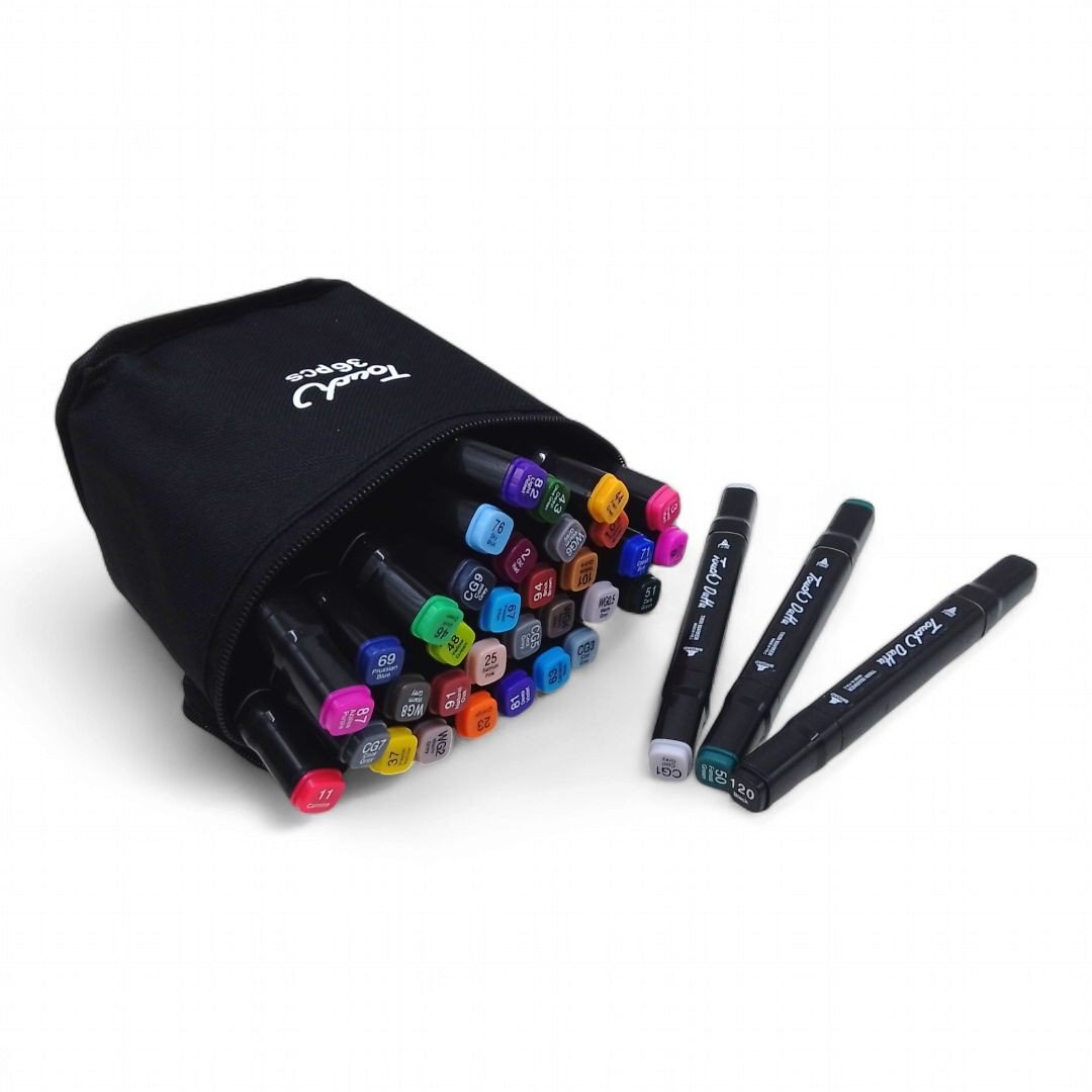 Набір складається з 36 фломастерів різних кольорів. На кожному з них зазначена назва кольору. Двосторонні – одна сторона з тонким стрижнем, для малювання або письма, а інша – з товстим, для виділення тексту. Запаковані в тканинний чохол на замочці.
