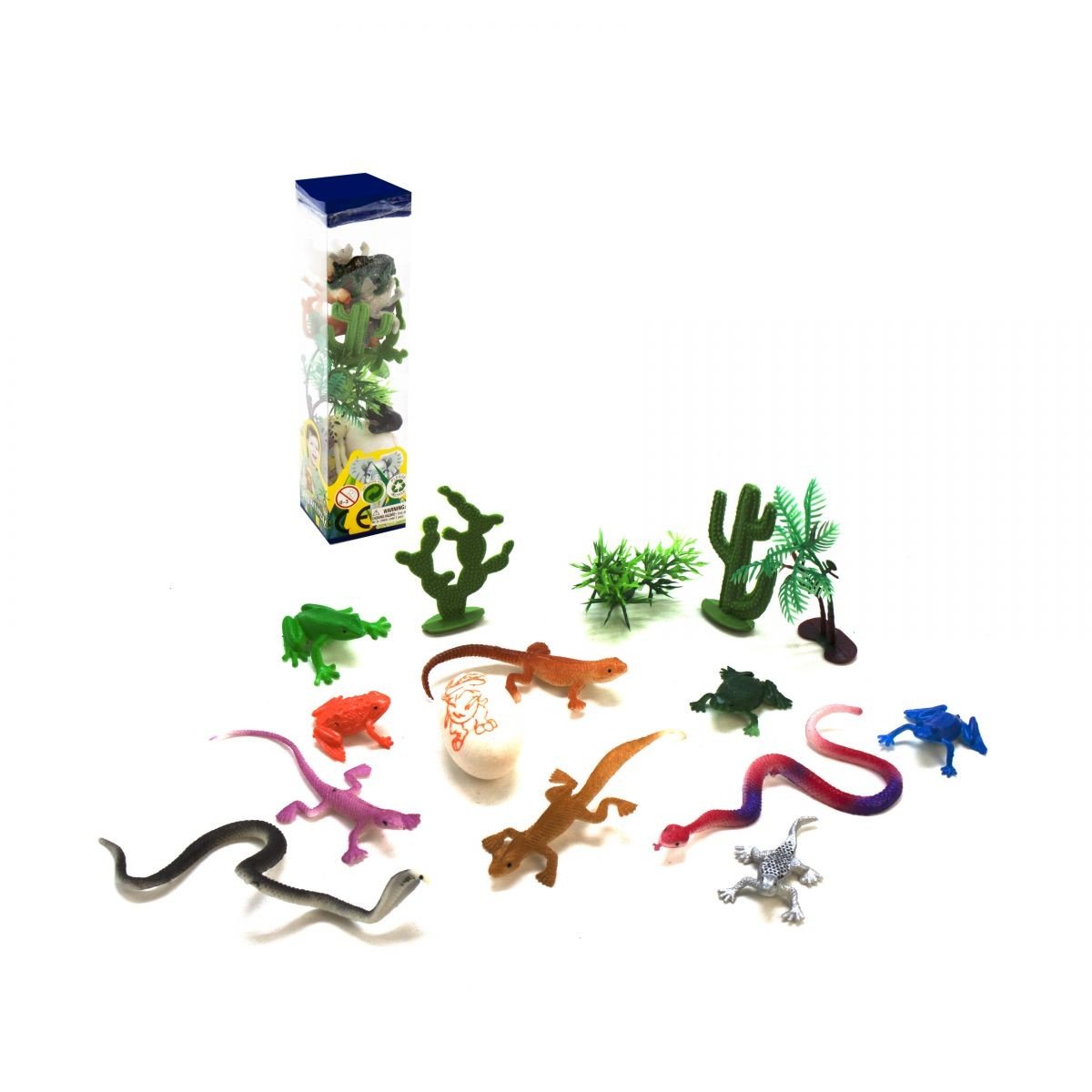 Набір складається з 12 пластикових фігурок в колбі з кришечкою у вигляді тварини. У колбі по 10 тварин, 4 дерева і яйце динозавра. Приблизний розмір фігурки - 3-6 см.