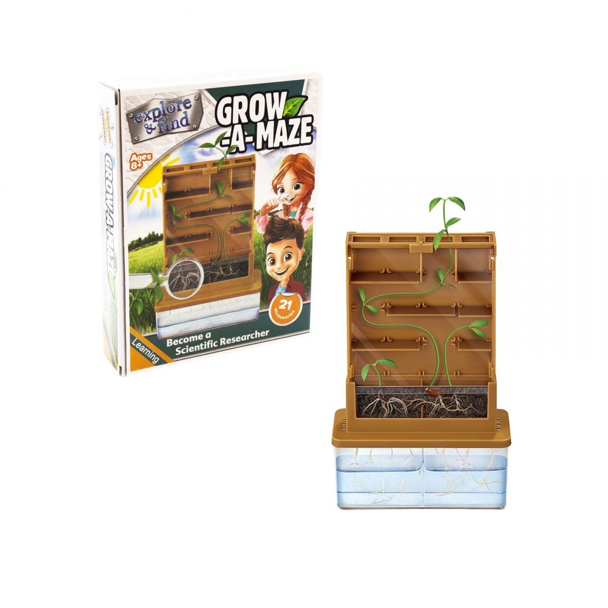 Зберіть з деталей набору науково-дослідний стенд і проведіть 3 захоплюючих експерименту: 1) Дивіться, як проростають насіння і розвивається їх коренева система; 2) Залишайте власний лабіринт і спостерігайте, як спритні паростки будуть звиватися між стінками і знаходити шлях до світла. 3) Влаштуйте справжнє змагання серед бобів. З'ясуйте, який паросток швидше за всіх добереться до "фінішу" і побачить сонце.