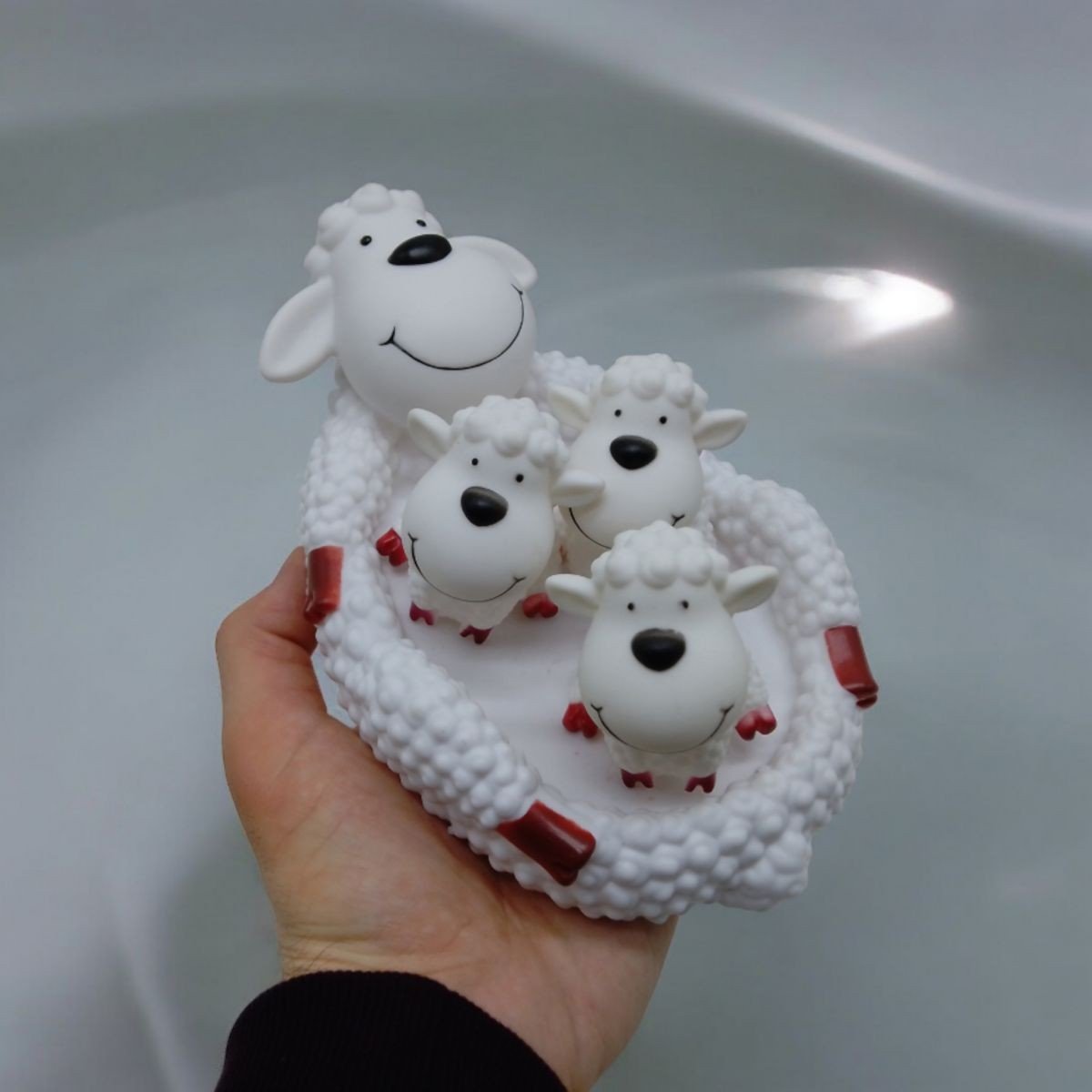 Мила гумова овечка , усередині якої сидять ще 3 маленькі ягнятка. Іграшка підійде для гри у ванній та зробить процес купання веселим та цікавим. Завдяки тому, що іграшки всередині порожнисті, в них можна набирати воду і бризкатися. Розмір великої овечки: 19х11,5х8 см. Розмір маленьких іграшок: 6х4х4 см.