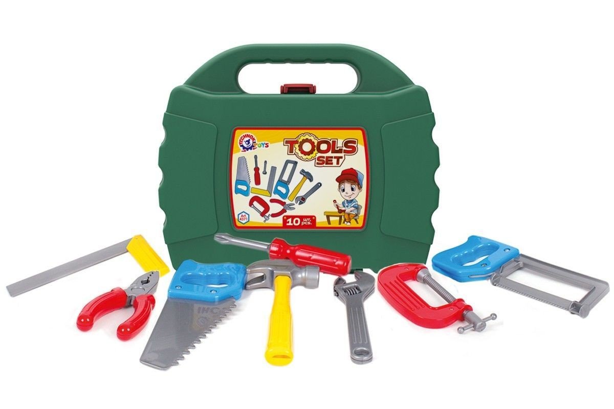 Бренд: Технок Упаковка: Без упаковки Колір: Різнобарв'я Габарити в упаковці: 27 x 24 x 8 см Габарити без упаковки: 27 x 24 x 8 см Країна виробник: Україна Матеріал: Пластик Комплектація: 10 шт. інструментів: молоток, 2 пилки, викрутка з 2ма насадками, розвідний ключ, плоскогубці, струбцина, кутник