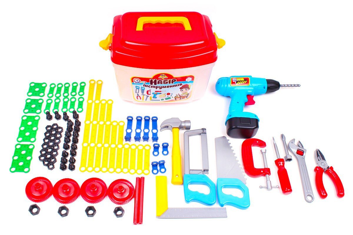 Набір інструментів ТехноК (94 елемента). Велика розмаїтість різних интсрументов і деталей: молоток, пилочки, викрутки, плоскогубці, дрилі, пластикові планки, куточки, пластини, гвинтики і гайки. Свердло у дрилі обертається при натисканні на кнопку (механічна, без батарейок).