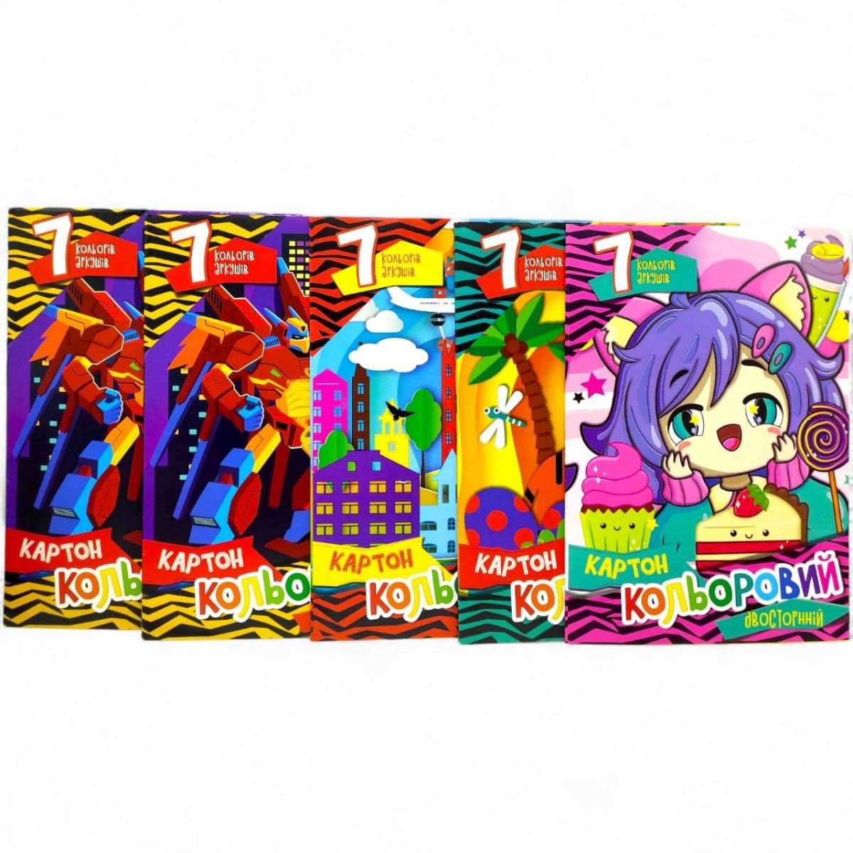 Опис Набір кольорового картону А4 (двосторонній), 7 арк (мікс видів)