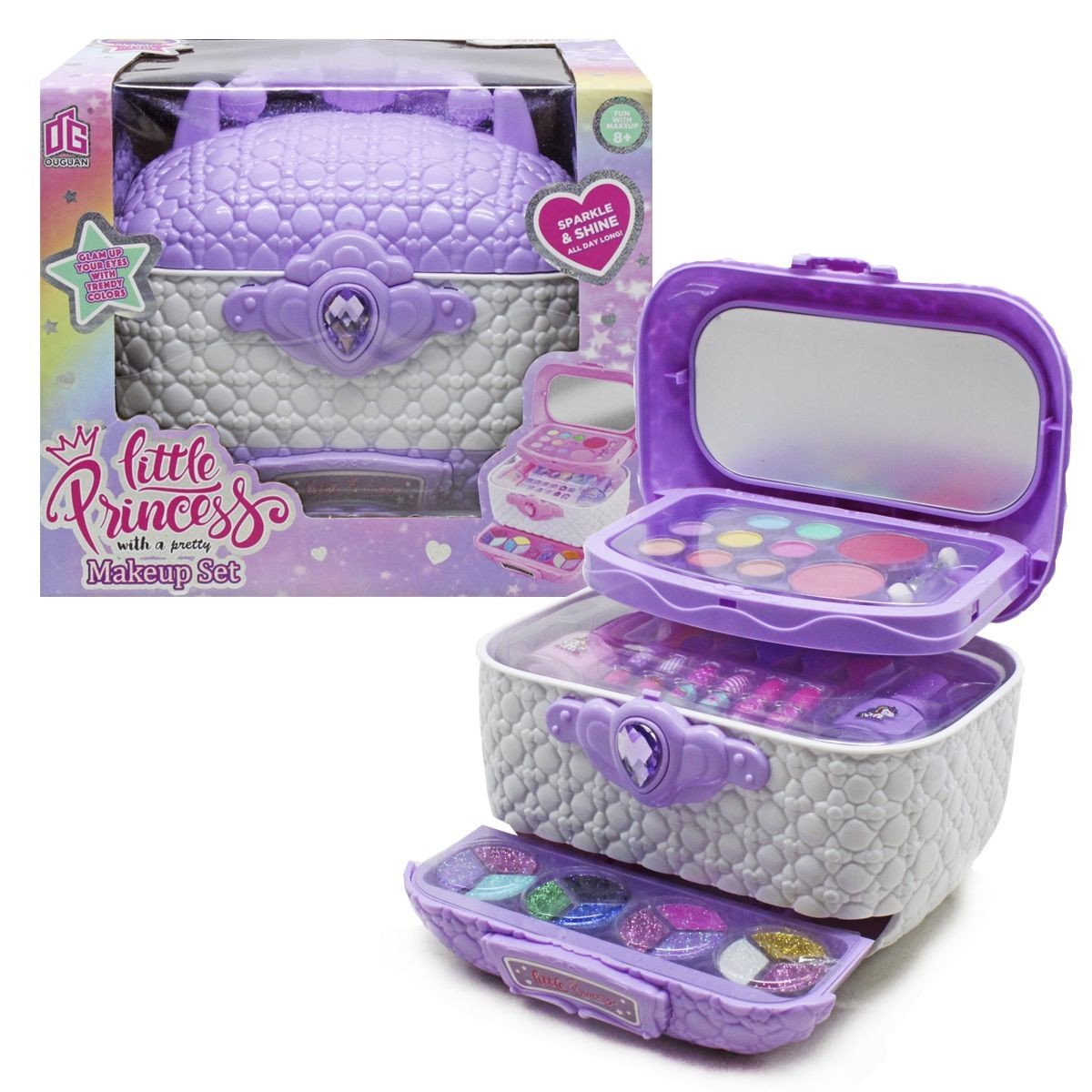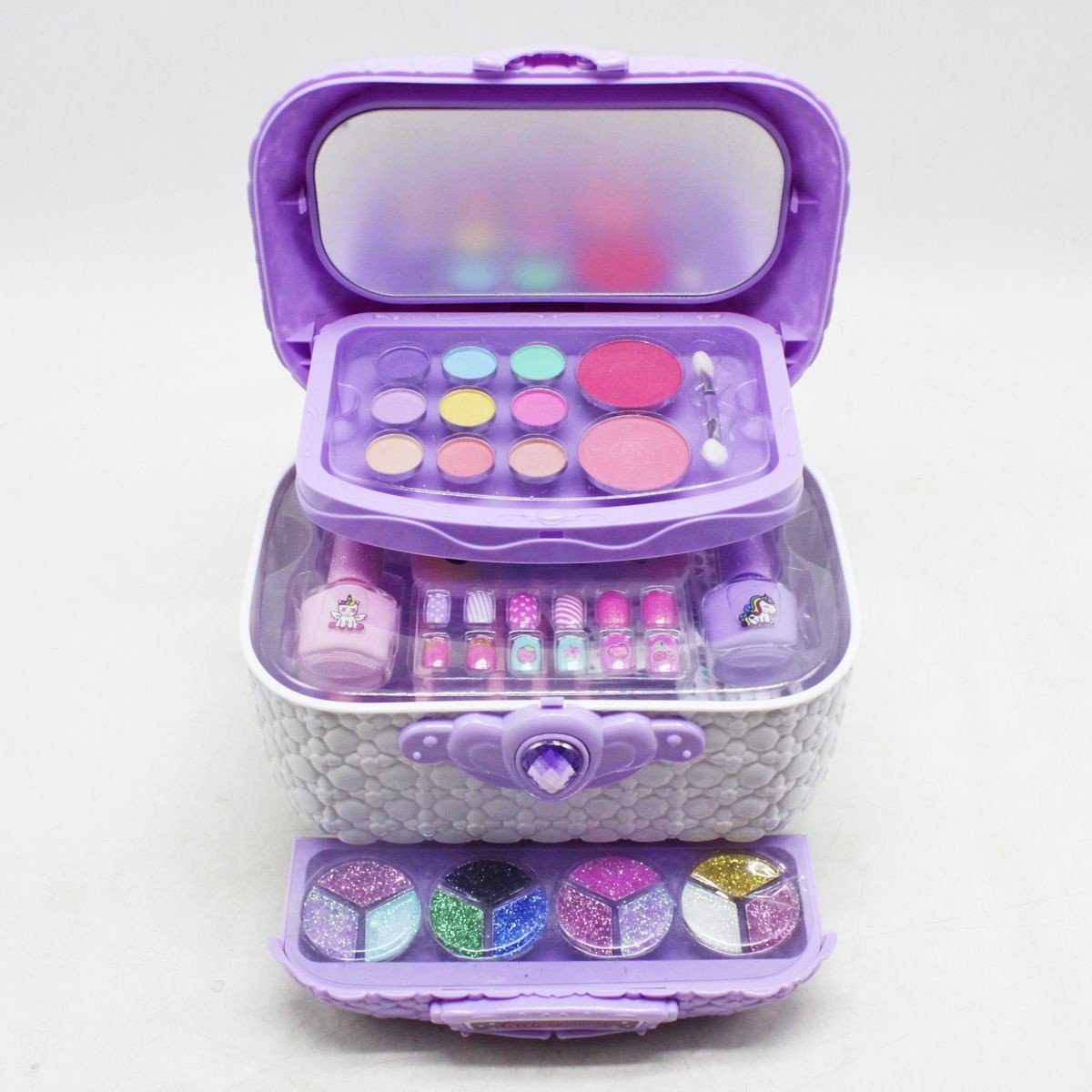 Великий набір косметики для справжньої принцеси. Комплект представлений у красивій пластиковій скриньці, відкривши яку, можна знайти три відділення з різними видами косметики. У наборі є тіні для повік (9 кольорів), румʼяна (2 кольори), аплікатор, 5 пензликів для нанесення макіяжу та гліттер для повік. Також у комплект входить різноманітне приладдя для манікюру та педикюру: пилка для нігтів, роздільник пальців для педикюру. 2 лаки для нігтів, 12 накладних нігтів та наклейки для манікюру. На внутрішній стороні кришки скриньки є зручне дзеркальце (перед використанням слід зняти захисну плівку).
