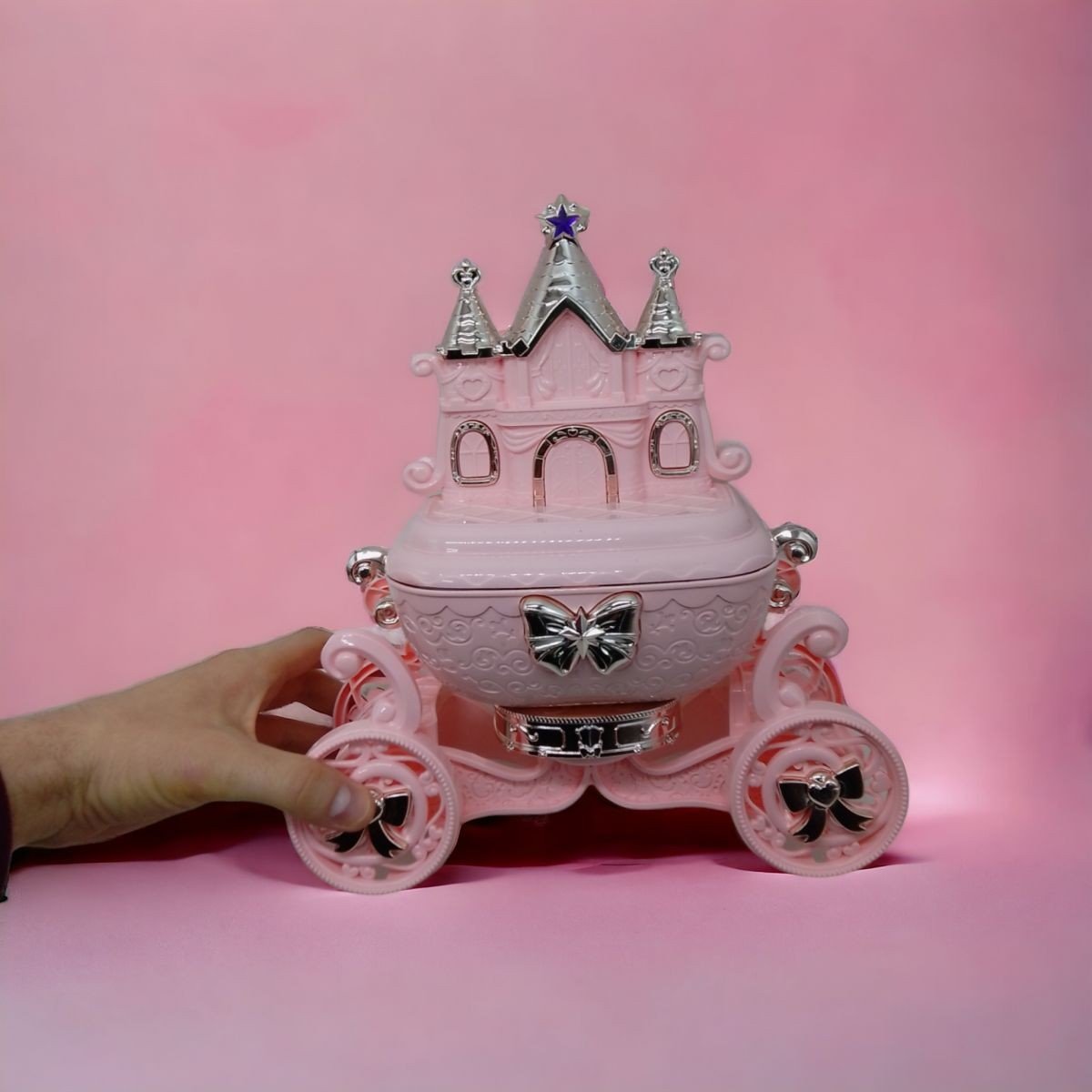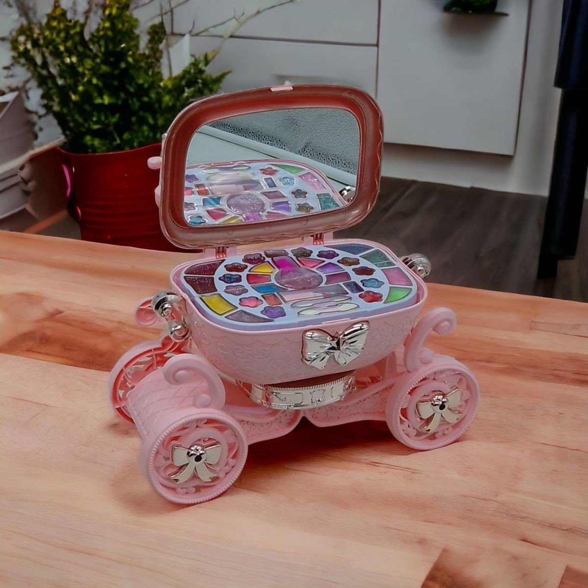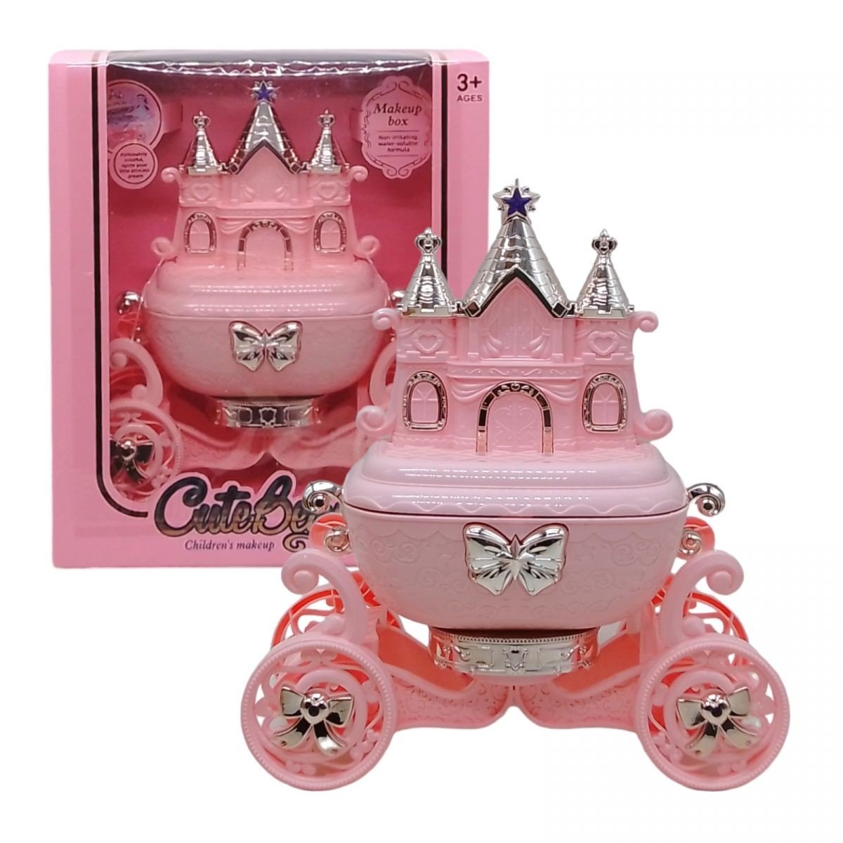 Великий набір косметики, укомплектований у гарну скриньку-карету. У наборі є безліч яскравих блисків для губ, лак для нігтів та зручний аплікатор для косметики. Карету можна розкрутити за допомогою викрутки, щоб відʼєднати скриньку. Замок можна зняти. Усередині скриньки є зручне дзеркальце.