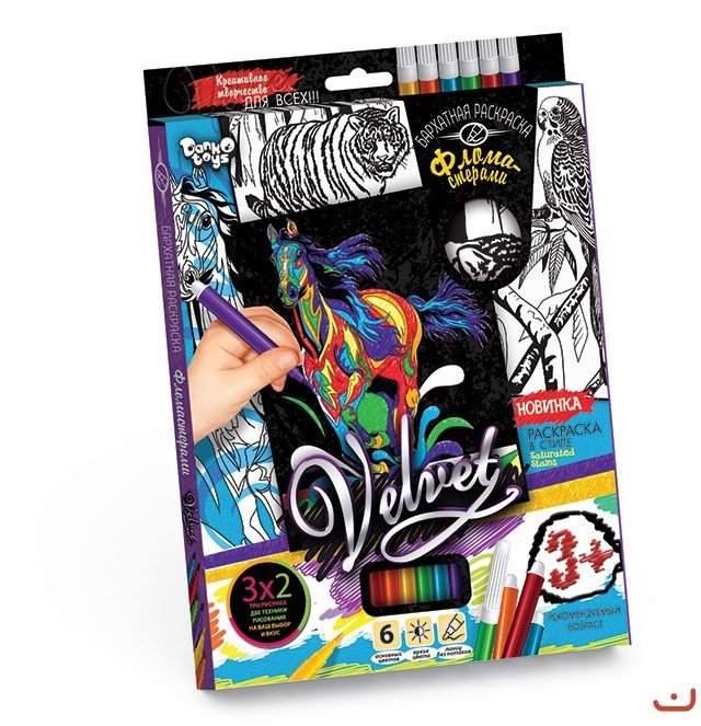 Набір креативної творчості "Оксамитова розфарбування фломастерами VELVET". Поєднання об'ємного чорного оксамиту і яскравих кольорів фломастерів, створює неповторний ефект і розвиває художній смак. Три малюнка різного розміру (14,8 х 21 см, 20,5 х 26 см і 14,8 х 21 см). 6 фломастерів.