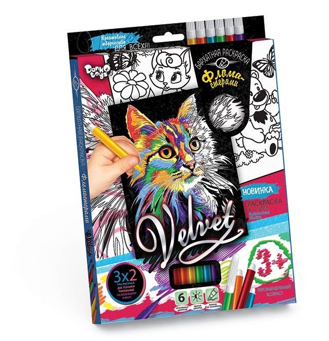 Набір креативної творчості "Оксамитова розфарбування фломастерами VELVET". Поєднання об'ємного чорного оксамиту і яскравих кольорів фломастерів, створює неповторний ефект і розвиває художній смак. Три малюнка різного розміру (14,8 х 21 см, 20,5 х 26 см і 14,8 х 21 см). 6 фломастерів.