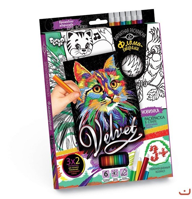 Набір креативної творчості "Оксамитова розфарбування фломастерами VELVET". Поєднання об'ємного чорного оксамиту і яскравих кольорів фломастерів, створює неповторний ефект і розвиває художній смак. Три малюнка різного розміру (14,8 х 21 см, 20,5 х 26 см і 14,8 х 21 см). 6 фломастерів.