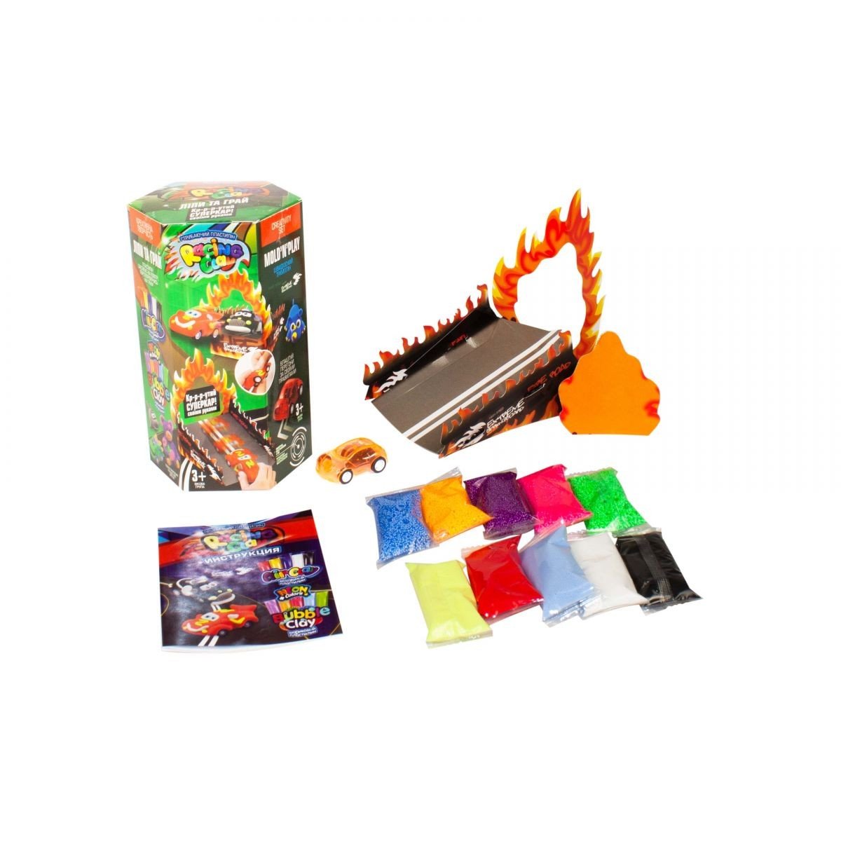 Набір креативної творчості "Racing Car". У грі Вам доведеться самостійно придумати дизайн свого авто і за допомогою повітряного і кулькового пластиліну зліпити його, використовуючи каркас інерційної машинки. У комплект йде трамплін для трюків.