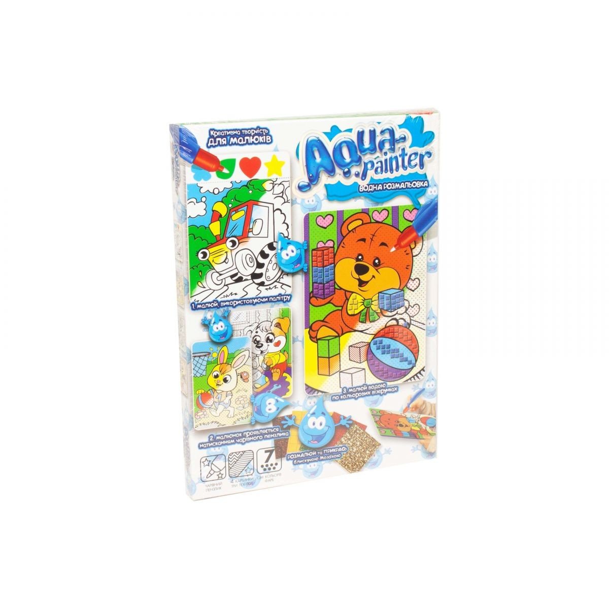 Набір креативної творчості "Водна розфарбування (Aqua painter)". На зображенні з контурами нанесена спеціальна фарба, яка "активується" за допомогою води, а "чарівна пензлик", заправляти водою не вимагає спеціальної ємності і малює натисканням. Після повного висихання, малюнок можна прикрасити блискучою мозаїкою. 4 картинки, три техніки. 7 кольорів фарб.