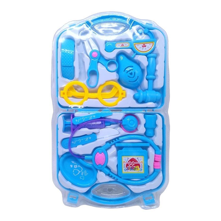 Бренд: MIC Упаковка: Слюда Колір: Блакитний Вага з упаковкою: 225 г Габарити в упаковці: 3 x 24 x 39 см Габарити без упаковки: 5 x 20 x 22 см Країна виробник: Китай Матеріал: Пластик Комплектація: стетоскоп, молоточок, шприц, ножиці, 2 скальпелі, апарат для вимірювання тиску, пластир, лоток, баночка з ліками, окуляри лікаря