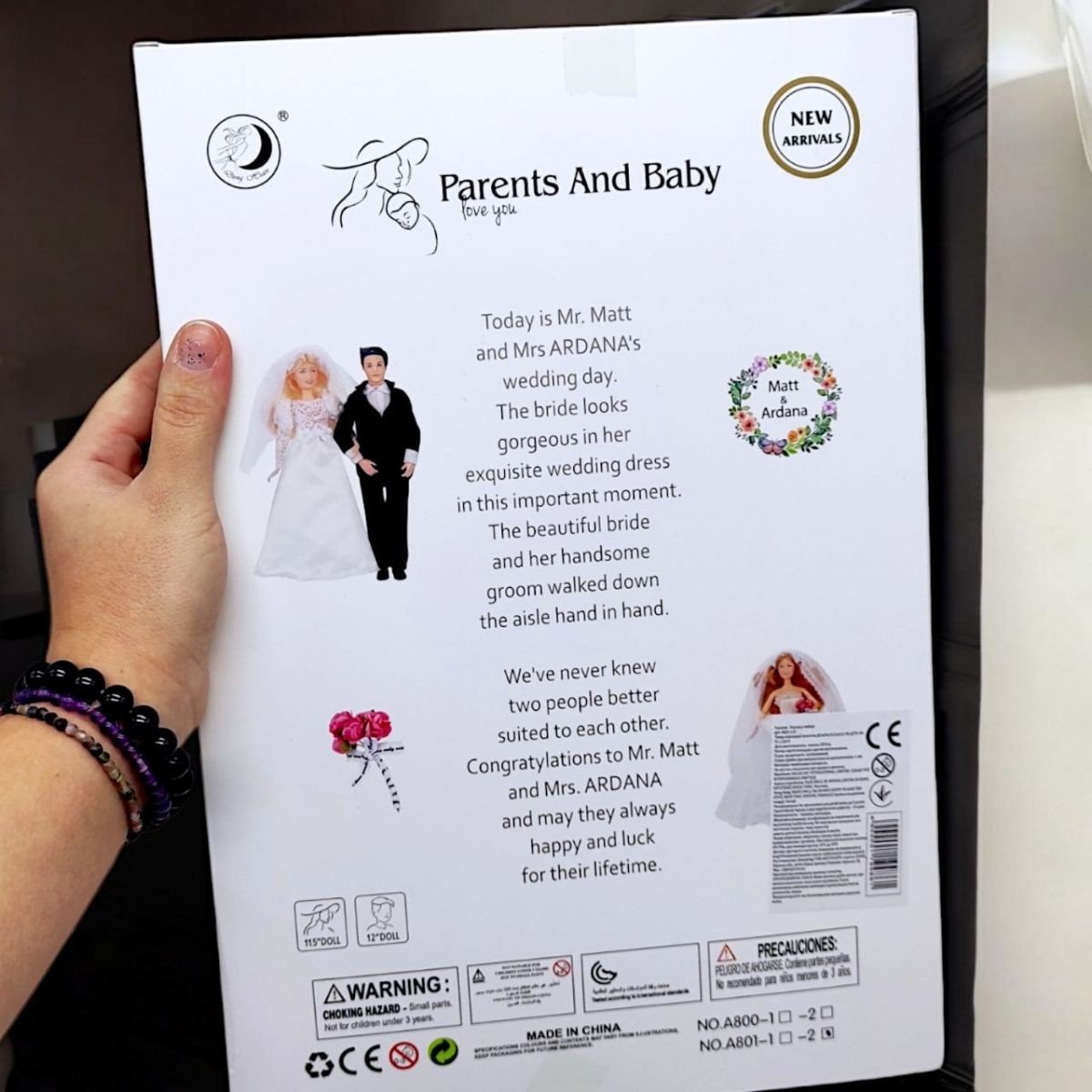Ігровий набір з двома ляльками (він і вона). Одягнені в весільне вбрання. Висота ляльок, приблизно 30 см. Виготовлені ляльки з якісних та безпечних матеріалів (тулуб і кінцівки - пластик, голови - гума). У обох ляльок руки з шарнірами. Ігри з ляльками чудово розвиватимуть у дітей сюжетне та образне мислення, уяву, соціальні навички та вміння гратися. Укомплектовано все в картонну коробочку зі слюдою. Рекомендовано для дітей старше 3-х років.