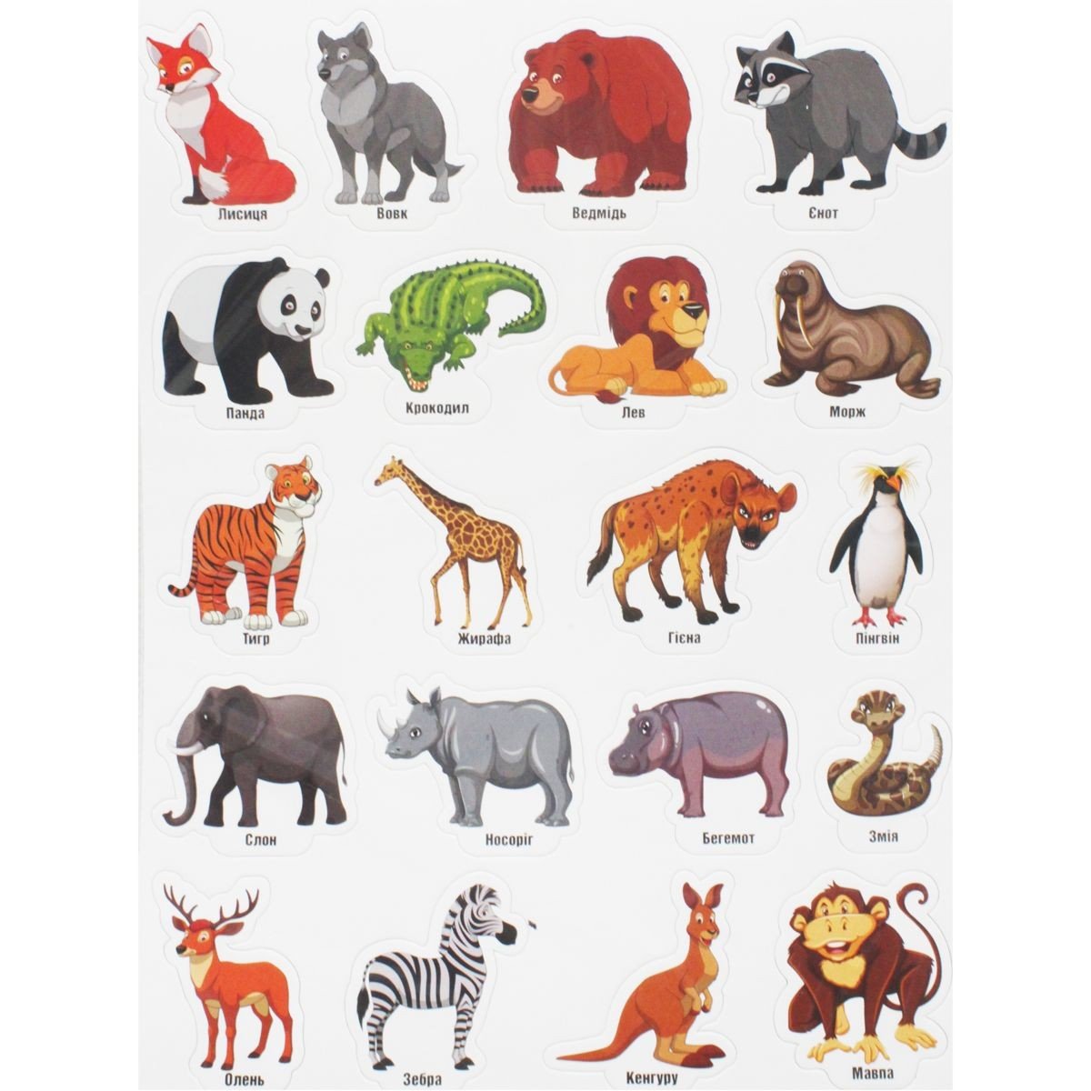 Набір з 20-ти магнітів з дикими тваринами на аркуші розміром 30х47 см. Кожне звірятко підписано українською мовою. Граючи з такими магнітами дитина зможе весело та легко вивчити світ дикої природи. Виконані з якісного та безпечного матеріалу. Для дітей віком від 3-х років.