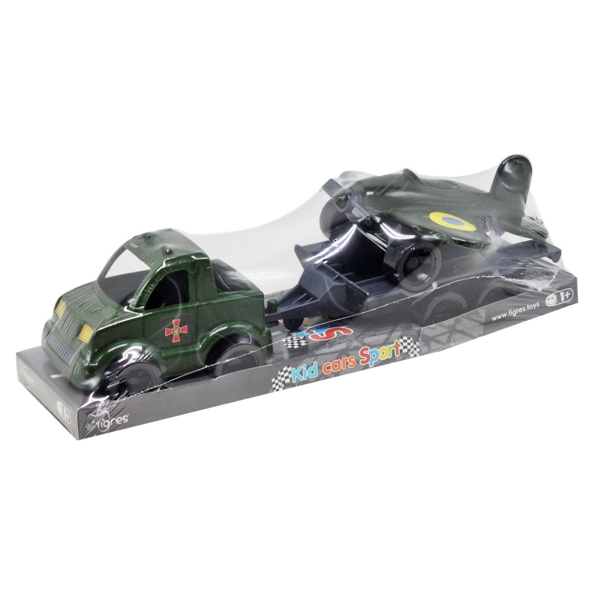 Набір двох пластикових військових машин: джип і літак на причепі. Причіп можна відчепити та грати з іграшками окремо. Джип прикрашений наклейками із символікою ЗСУ. Розмір джипа – 8х6х6 см, розмір літака – 11х11х5 см. Набір виконаний з міцного пластику. Виготовлено в Україні.