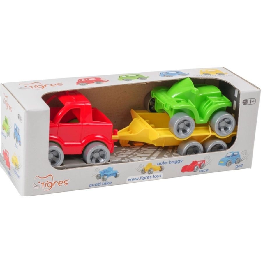 Набір складається з машинки пікапа, до якого кріпиться причіп на колесах, за допомогою якого автобус може перевозити квадроцикл. Розмір однієї машинки: 9 см. Машинки дуже яскраві, виготовлені з якісного пластику.