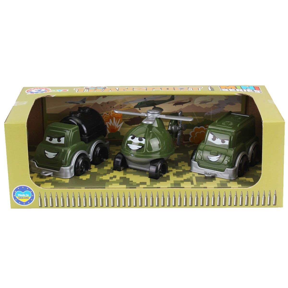 Набір складається з трьох іграшок: дві військові машинки і гвинтокрил з лопатями, що обертаються. На іграшках зображені кумедні личка, дизайн іграшок обов'язково сподобається навіть найменшим. Виконані із міцного пластику. Розмір однієї іграшки: 9х5х5 см.